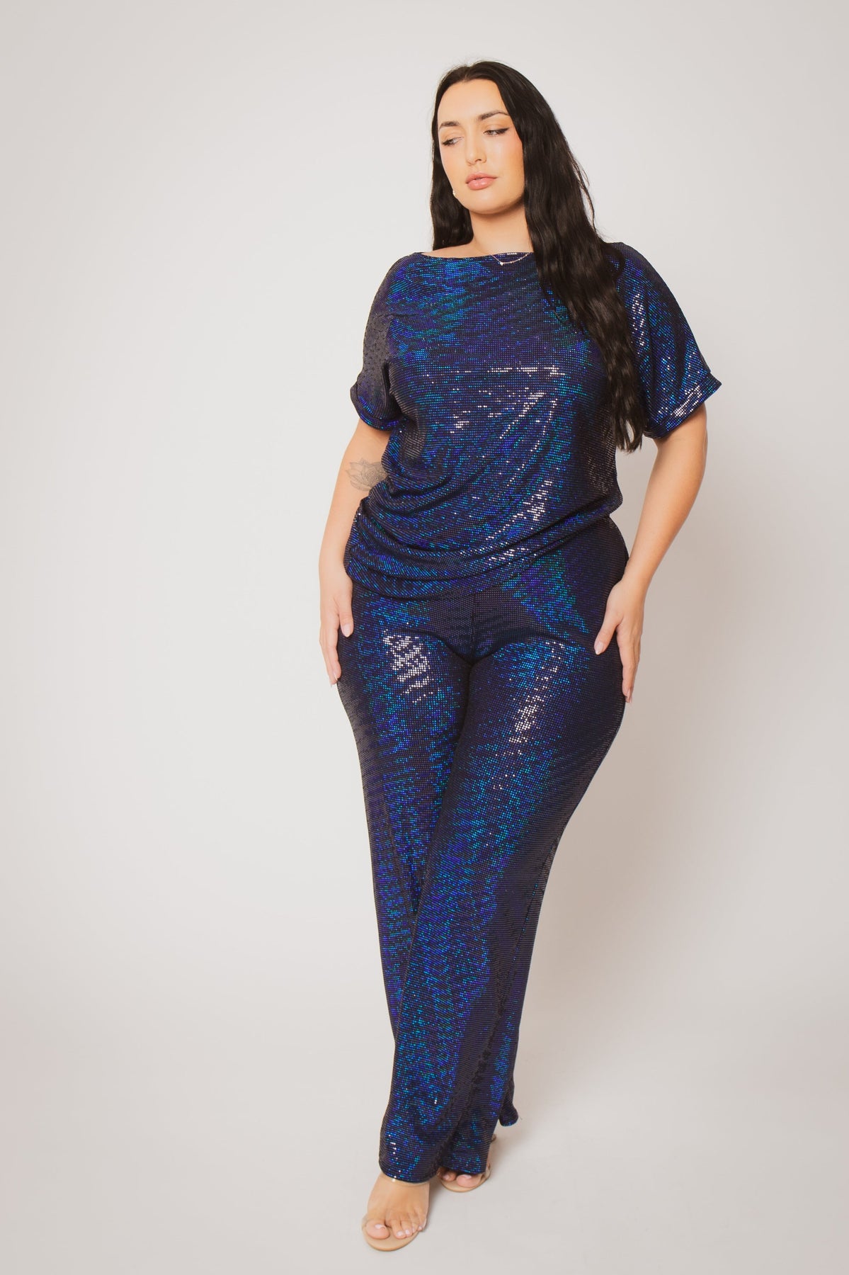 A KNIT MATCHING SET FEATURING AN ALLOVER TRACE SEQUINS, A WIDE BOAT NECKLINE, SHORT DOLMAN SLEEVES, AND ASYMMETRICAL HEM, AS WELL AS A MATCHING PAIR OF WIDE-LEG PANTS WITH AN ELASTICIZED HIGH-RISE WAISTPLUS SIZE PANTS SET, OFF SHOULDER TOP, WIDE PANTS, LUREX, SHINE, HOLIDAY, GOING OUT