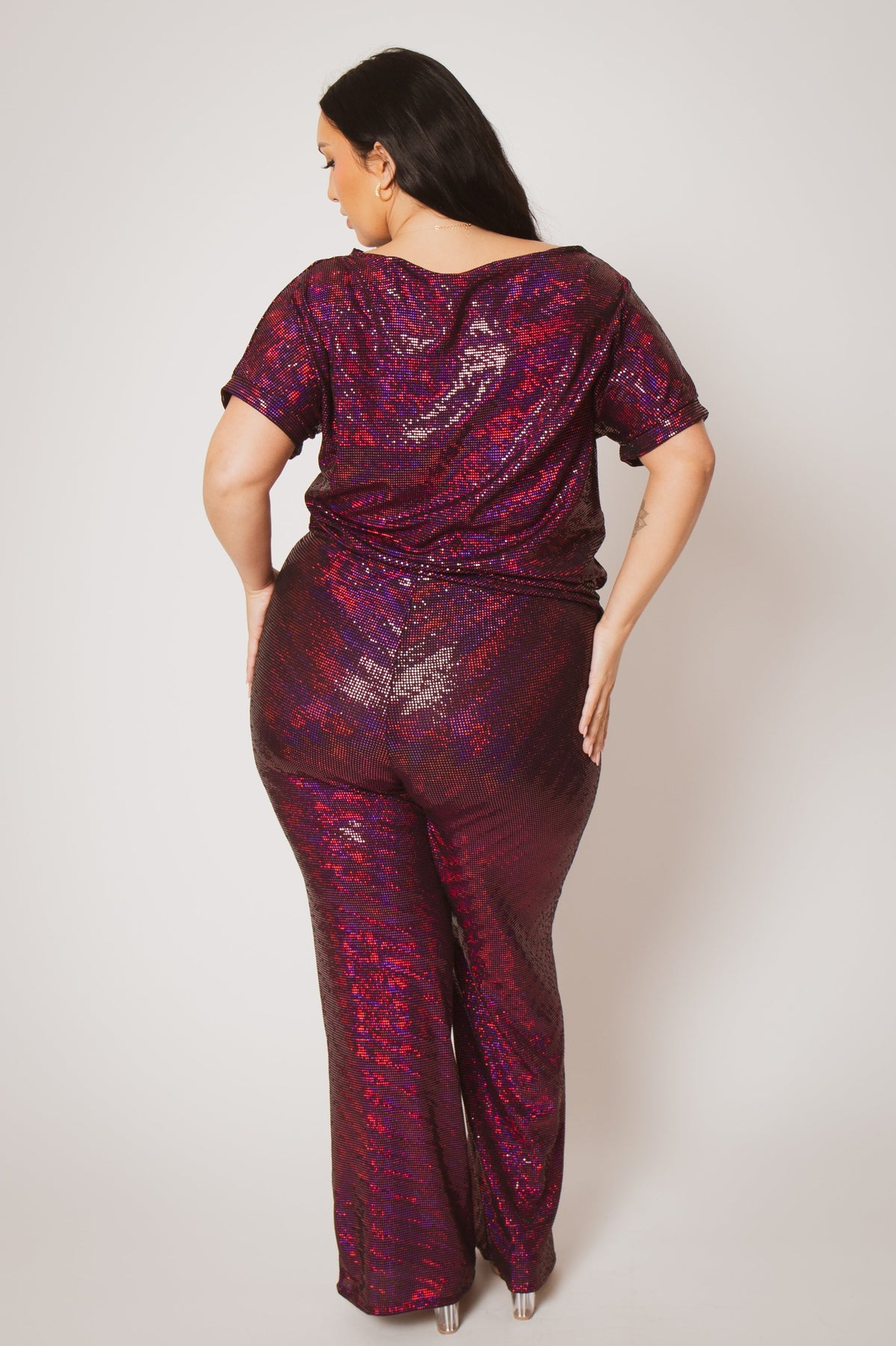 A KNIT MATCHING SET FEATURING AN ALLOVER TRACE SEQUINS, A WIDE BOAT NECKLINE, SHORT DOLMAN SLEEVES, AND ASYMMETRICAL HEM, AS WELL AS A MATCHING PAIR OF WIDE-LEG PANTS WITH AN ELASTICIZED HIGH-RISE WAISTPLUS SIZE PANTS SET, OFF SHOULDER TOP, WIDE PANTS, LUREX, SHINE, HOLIDAY, GOING OUT