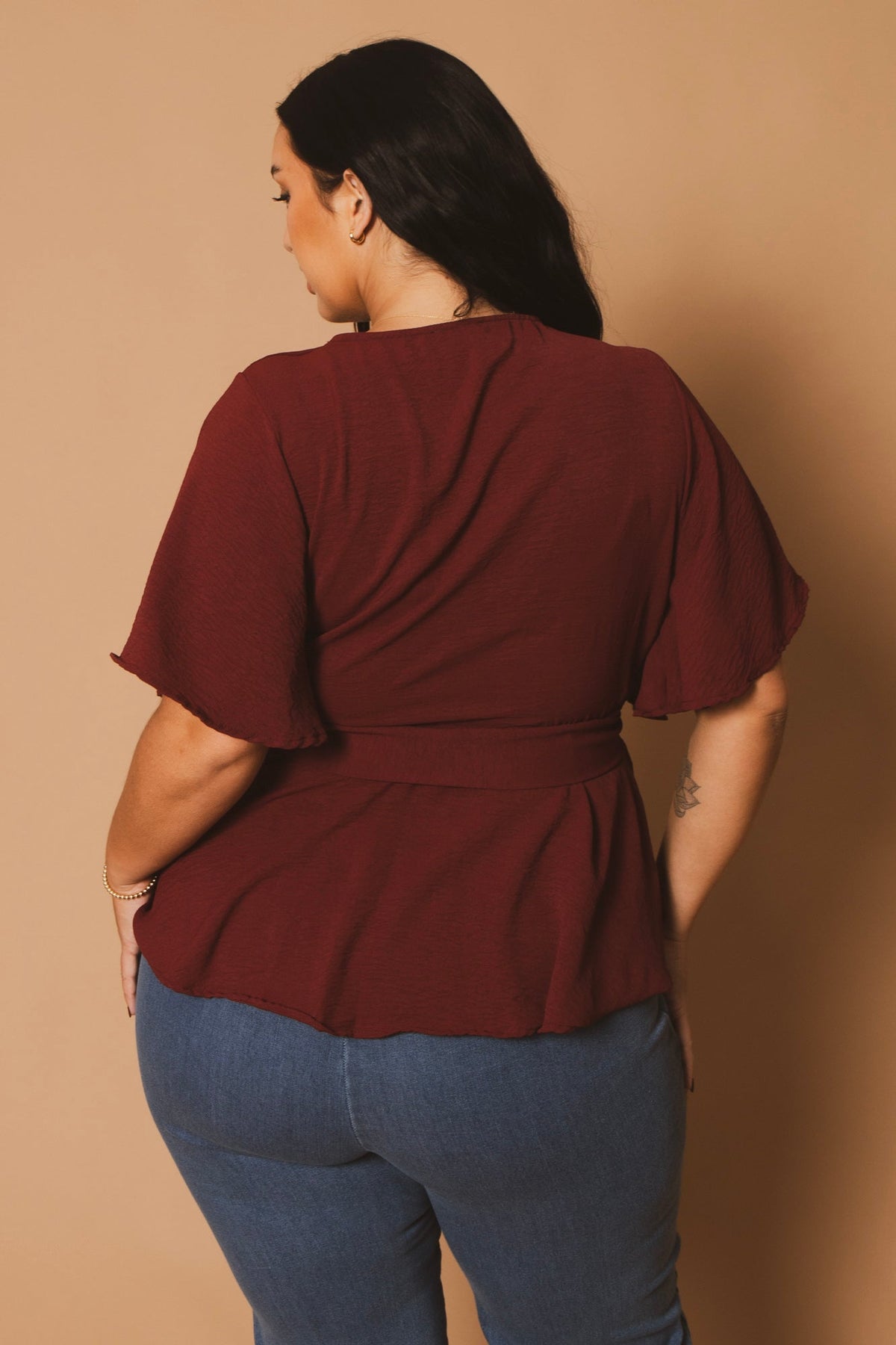 This plus size top features a surplice wrap front with flutter sleeves and a self-tie waist that flatters your curves. Designed with a peplum hem, it offers a flowy, feminine finish perfect for both casual and dressy looks.