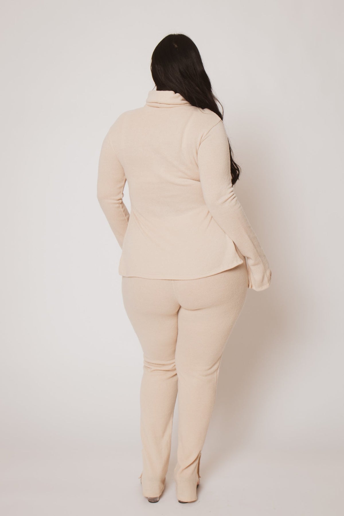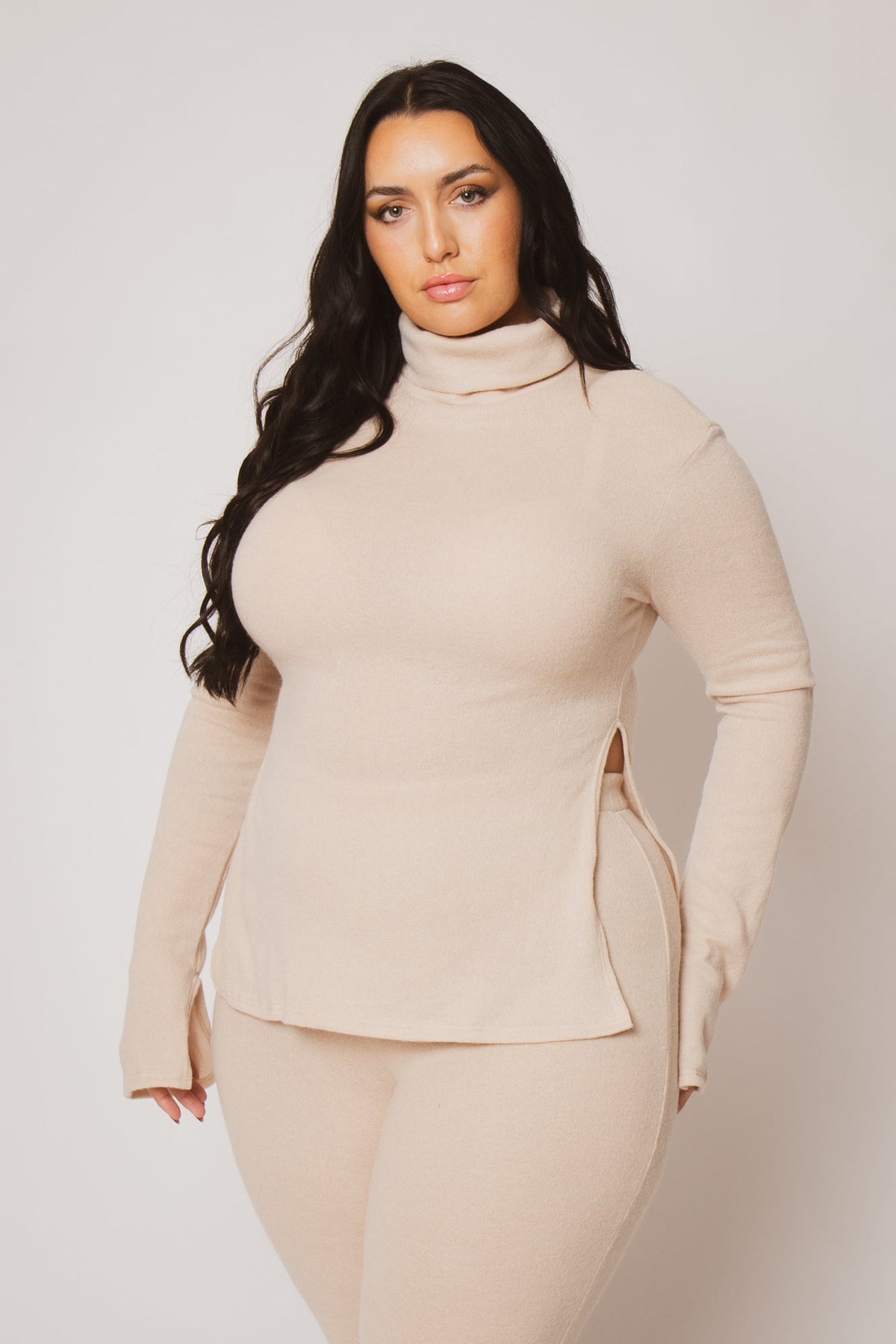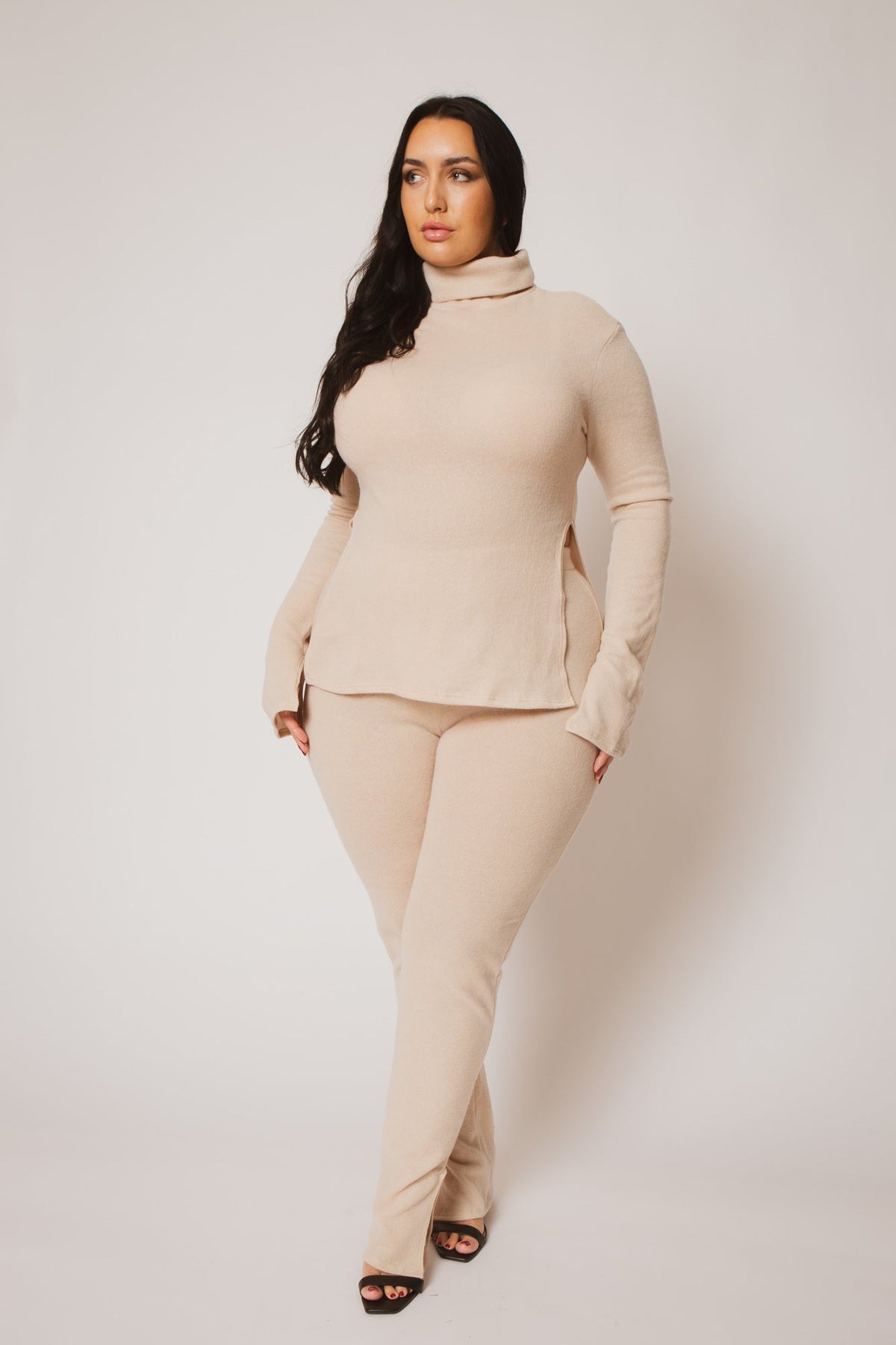 This plus size two piece set features a soft knit fabric with a cozy turtleneck top and matching fitted pants. Designed with side slits and a sleek fit, it’s perfect for lounging or stepping out in effortless style.