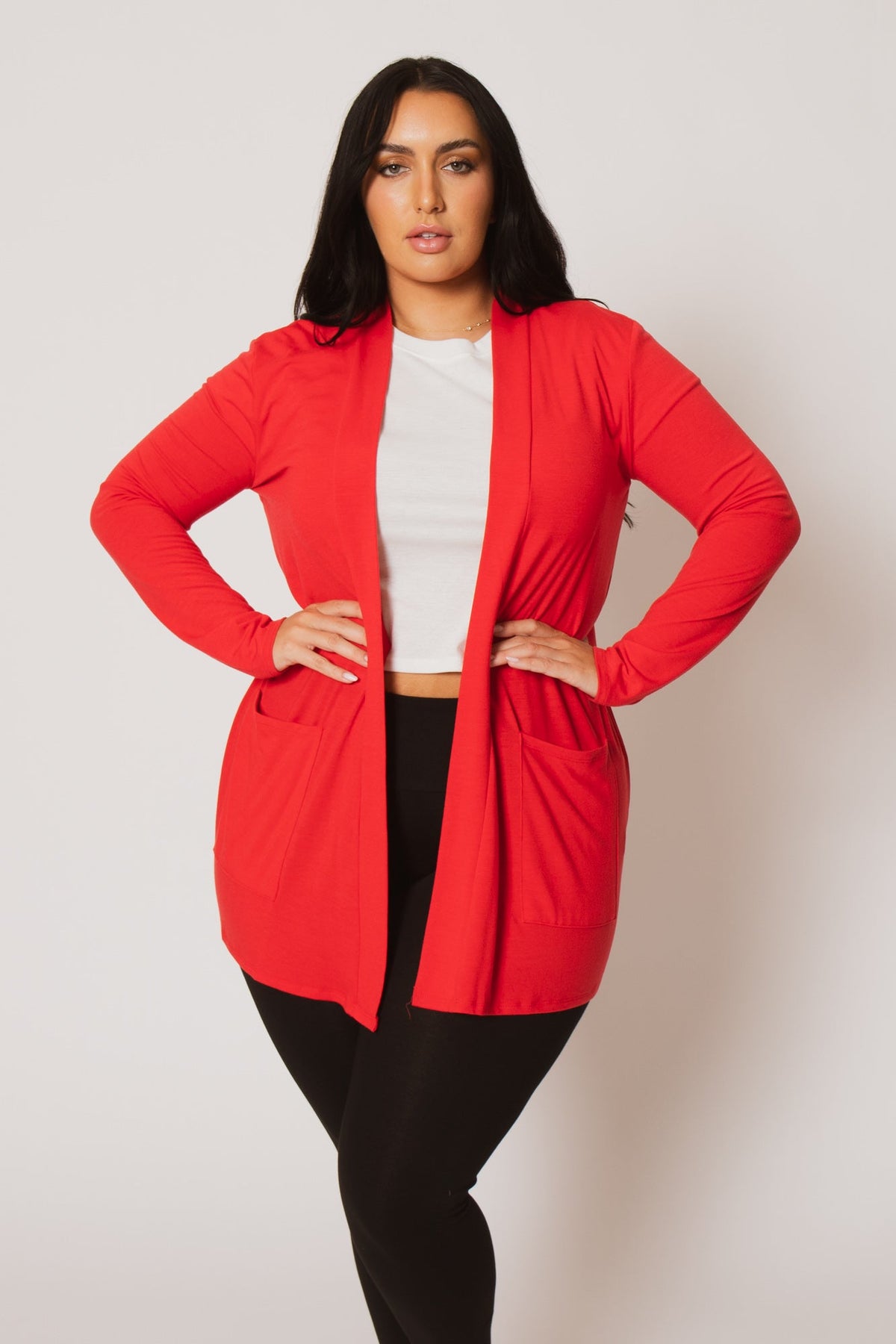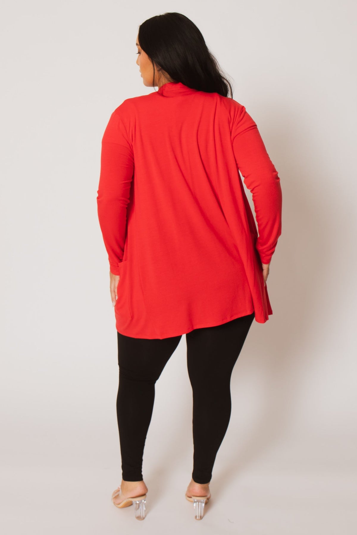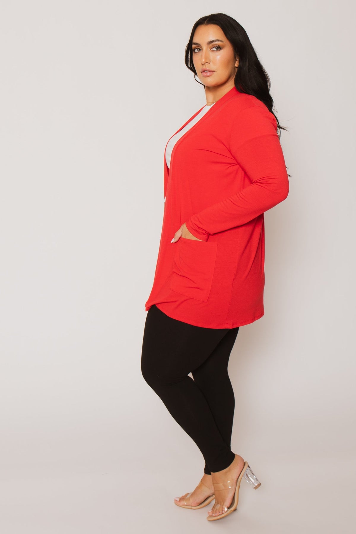This plus size cardigan features an open front design, long sleeves, and convenient front patch pockets for easy layering. Style it with your favorite belt for a polished and versatile look.