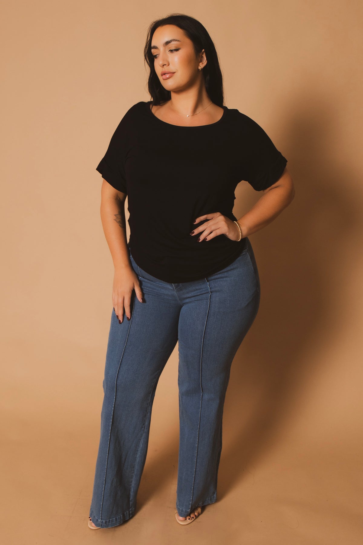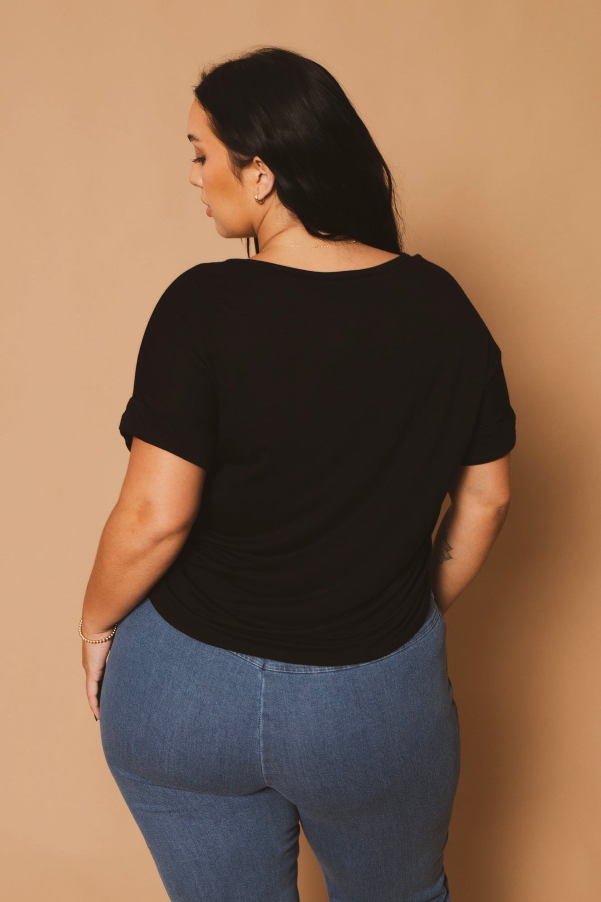 This plus size top features a scoop neckline, short sleeves with rolled cuffs, and a relaxed fit for everyday comfort. Made from soft stretch fabric, it’s the perfect basic to pair with jeans, shorts, or skirts for effortless style.
