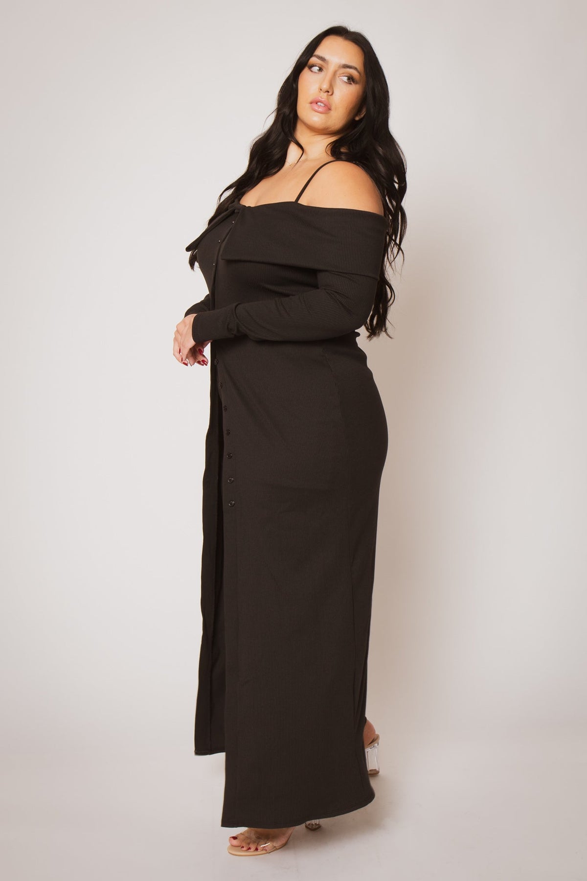 This plus size 2pc set features a long off-the-shoulder button-down top with a folded neckline detail and adjustable styling. The matching ribbed leggings offer a comfortable, stretchy fit that completes this chic, streamlined look.