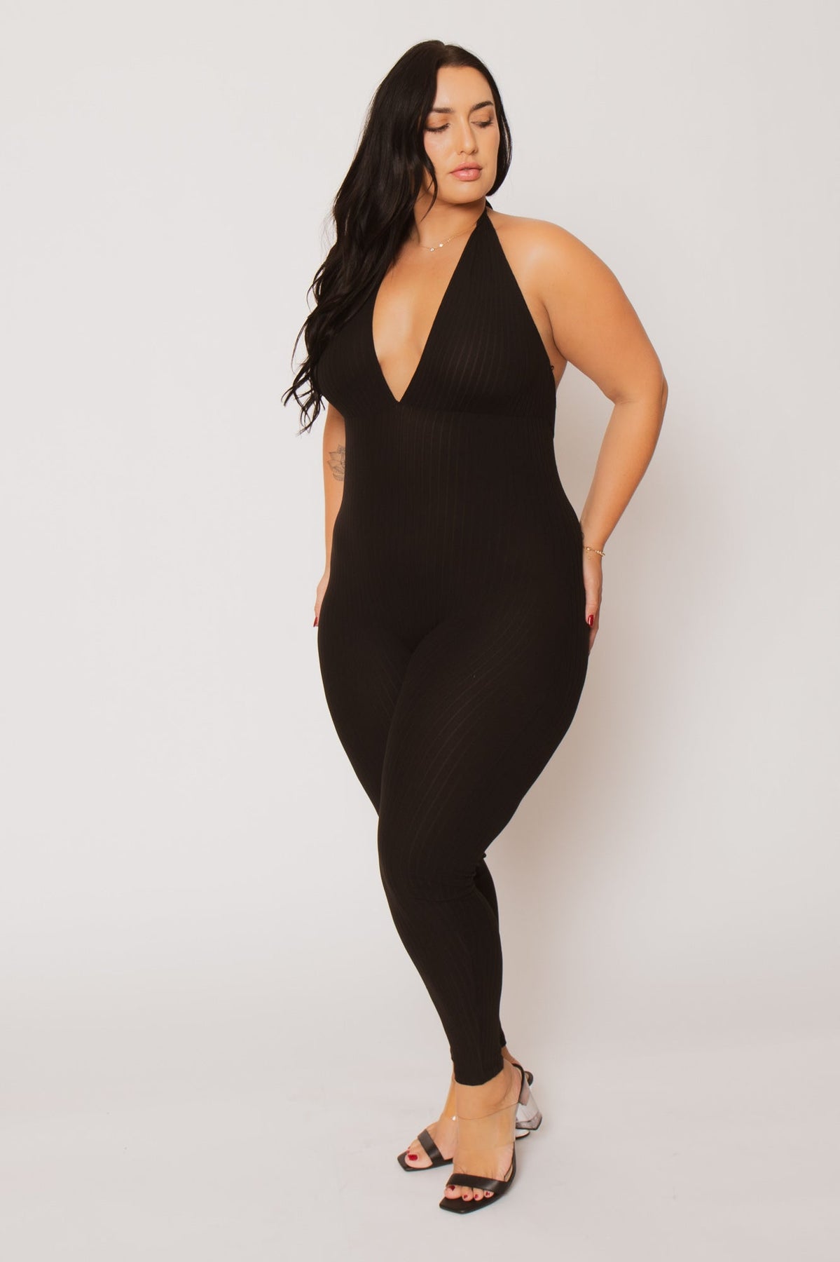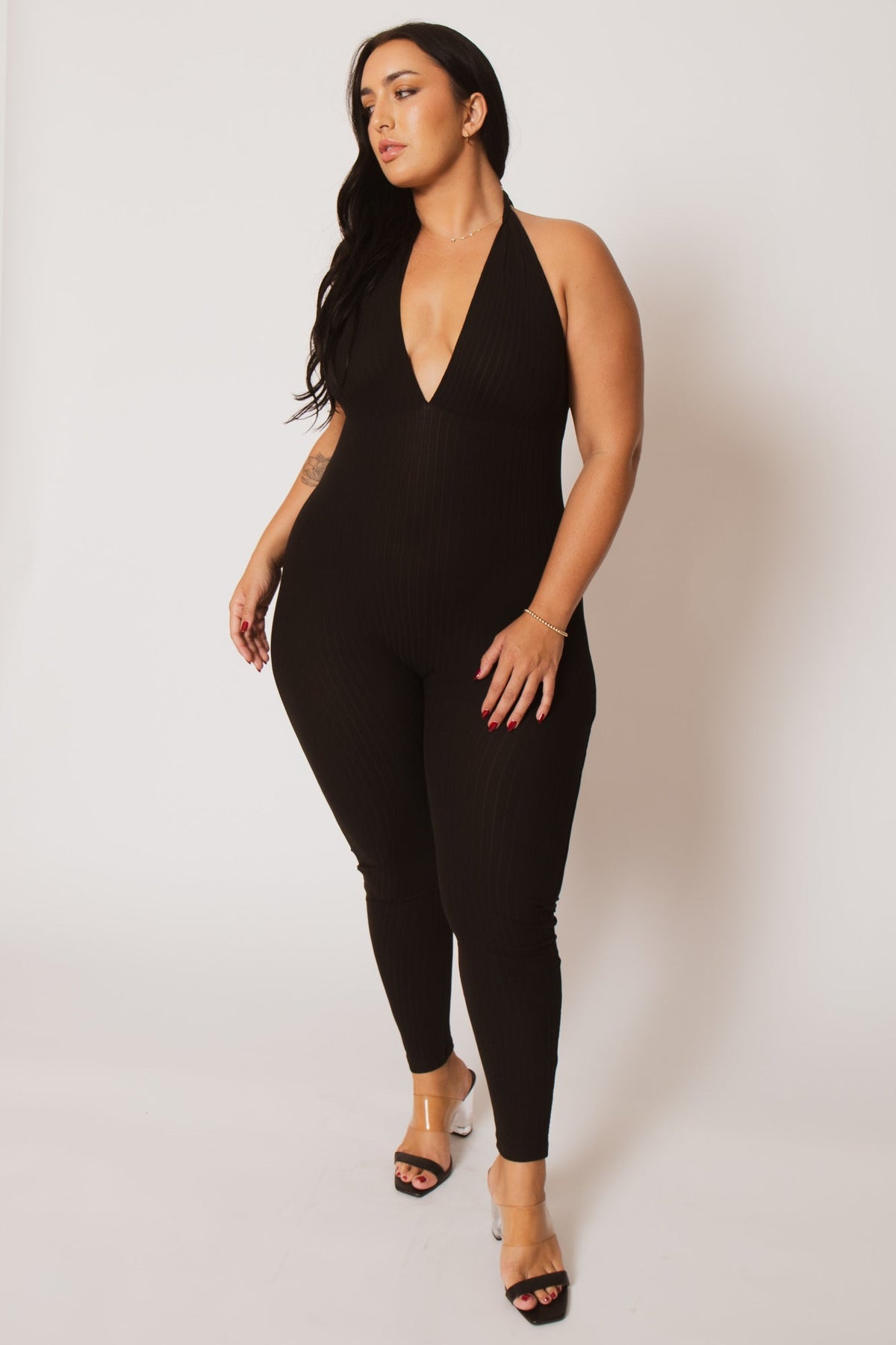 This plus size jumpsuit features a plunging halter neckline, a curve-hugging ribbed knit fabric, and an open back with tie closure. Sleek and sultry, it’s the perfect one-piece for making a bold statement day or night.