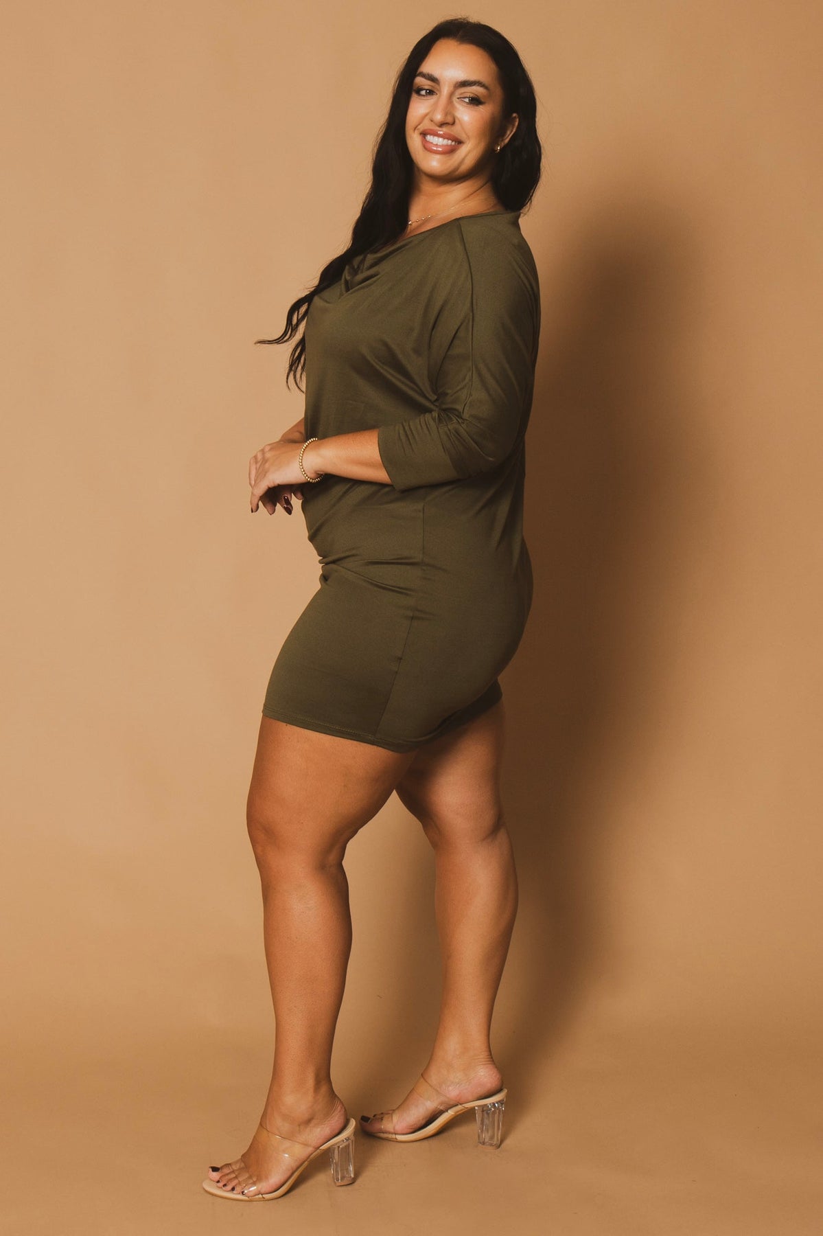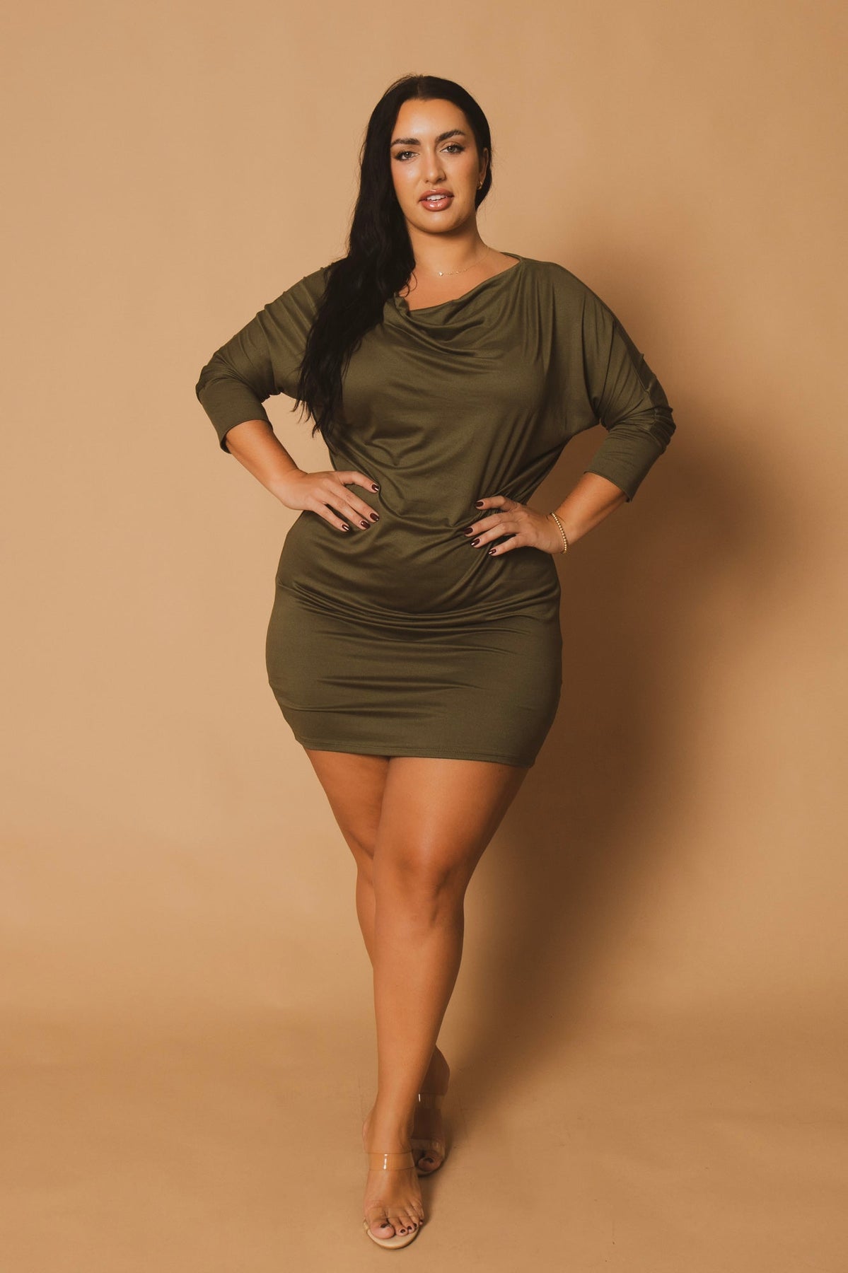 This Plus size mini dress featuring a sophisticated draped cowl neckline and long sleeves with cuffed details for a polished look. Designed with a flattering, curve-skimming fit