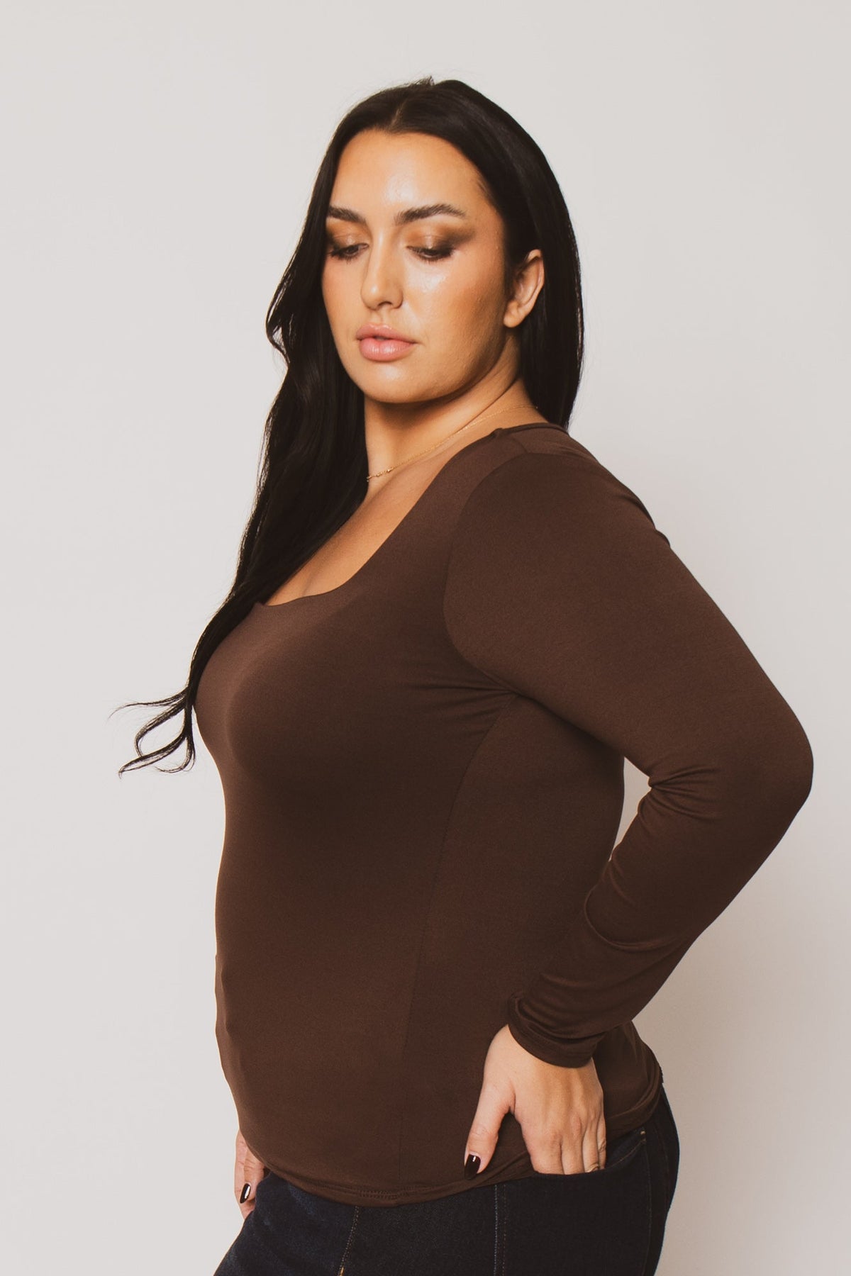 This plus size top features a flattering square neckline and long sleeves for a sleek, modern silhouette. Made from a soft, stretchy fabric, it offers a smooth fit that’s perfect for layering or wearing on its own.