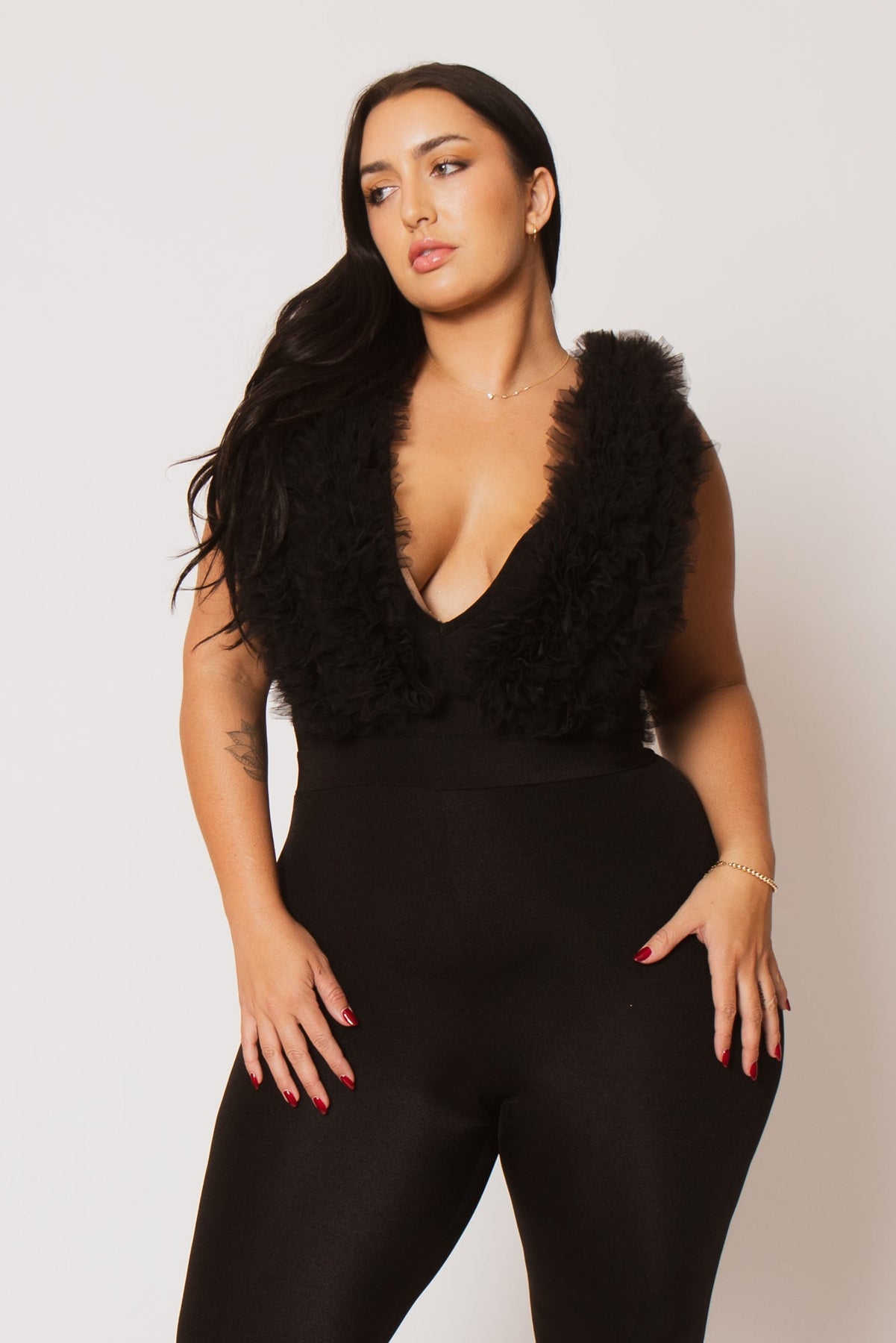 This plus size jumpsuit features a deep V-neckline trimmed with dramatic ruffled tulle and a curve-hugging silhouette. Finished with flared legs and a plunging back, it’s a bold statement look perfect for nights out.