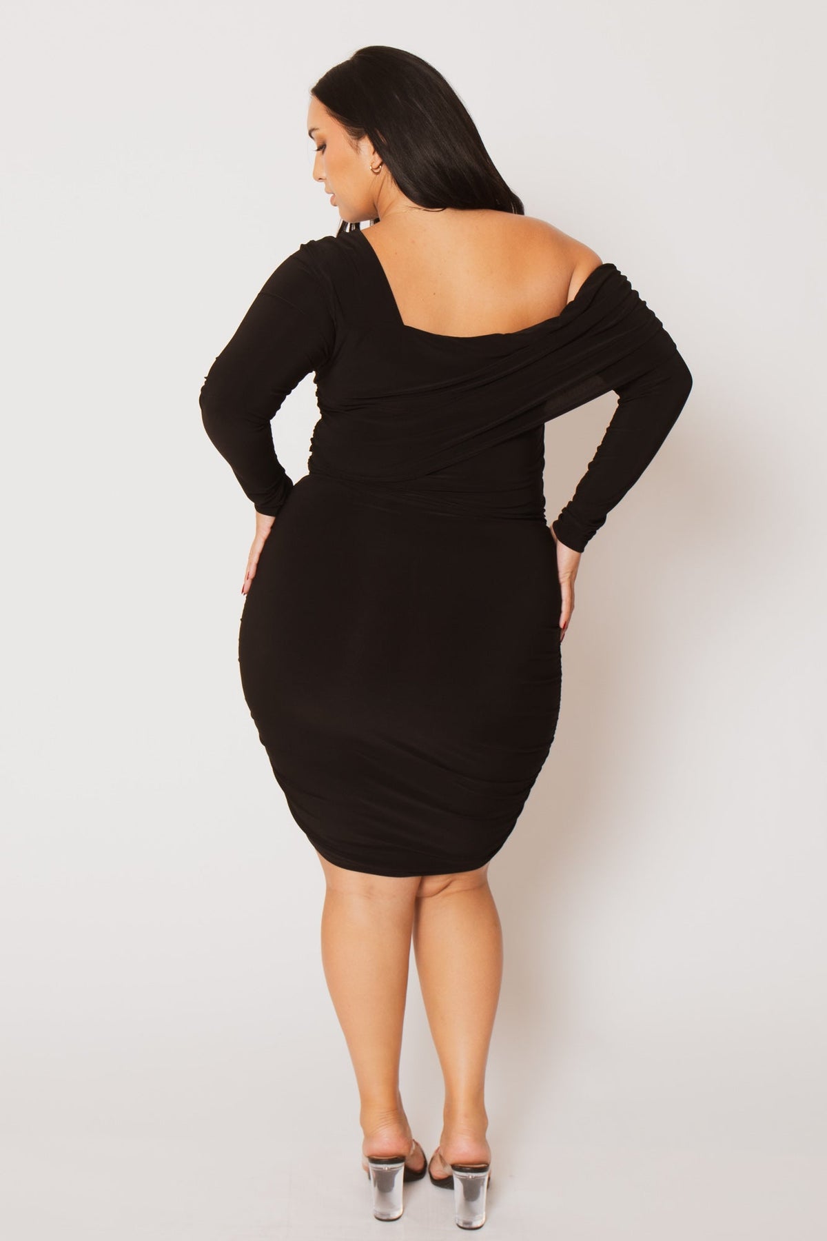 This plus size dress features a flattering square neckline, long sleeves, and ruched detailing throughout for a body-hugging fit. Designed with a versatile silhouette, it can be styled on or off the shoulder for an effortlessly chic look.
