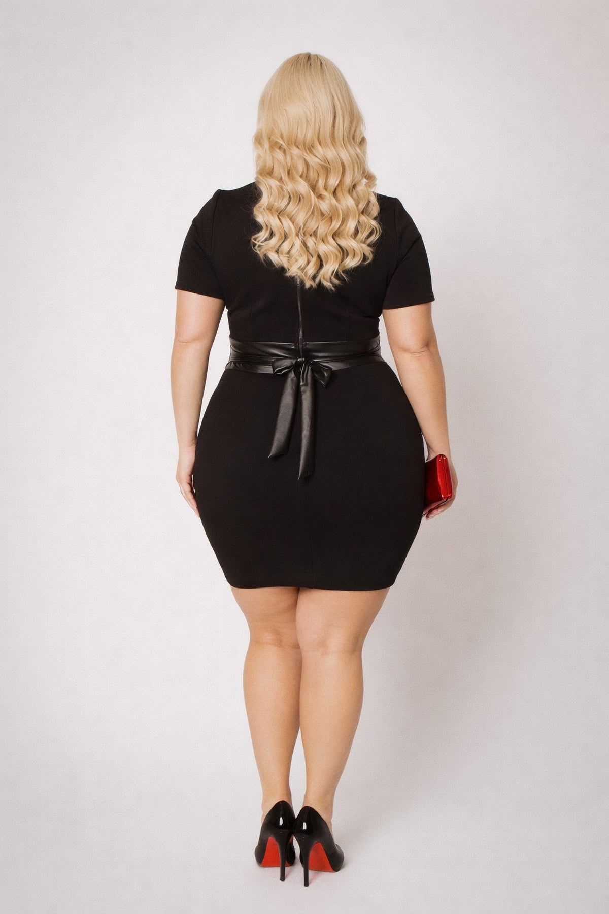 This plus size dress features a sleek bodycon silhouette with short sleeves and a smooth, curve-hugging fit for a polished look. Finished with a removable faux leather waist belt that can be worn tied, swapped, or styled without for versatile wear day to night.