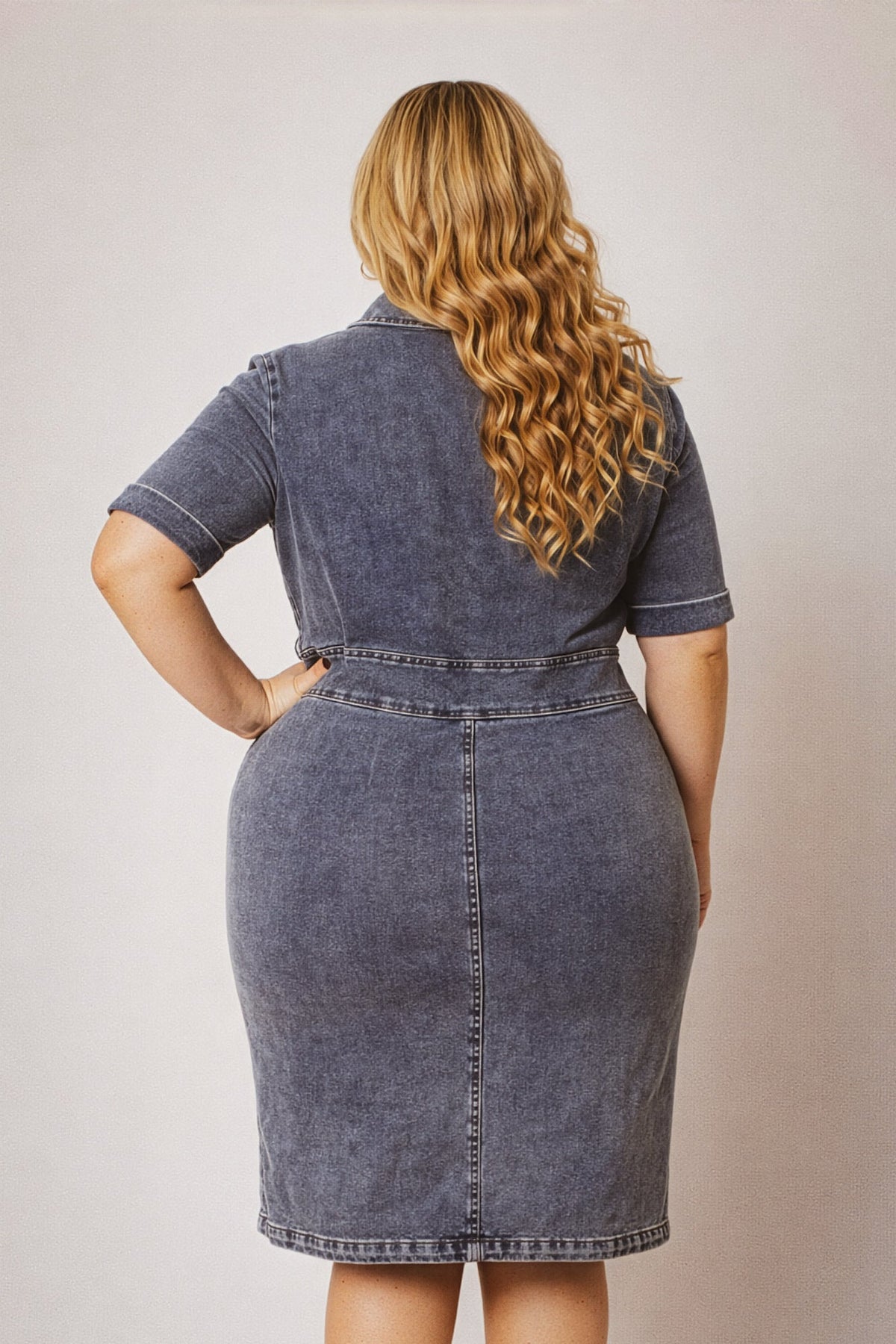 This plus size dress features a collared neckline with a split V-placket, short sleeves, and a curve-hugging denim silhouette. Designed with a unique oversized side pocket and a front slit, it adds standout style while keeping the fit sleek and flattering.