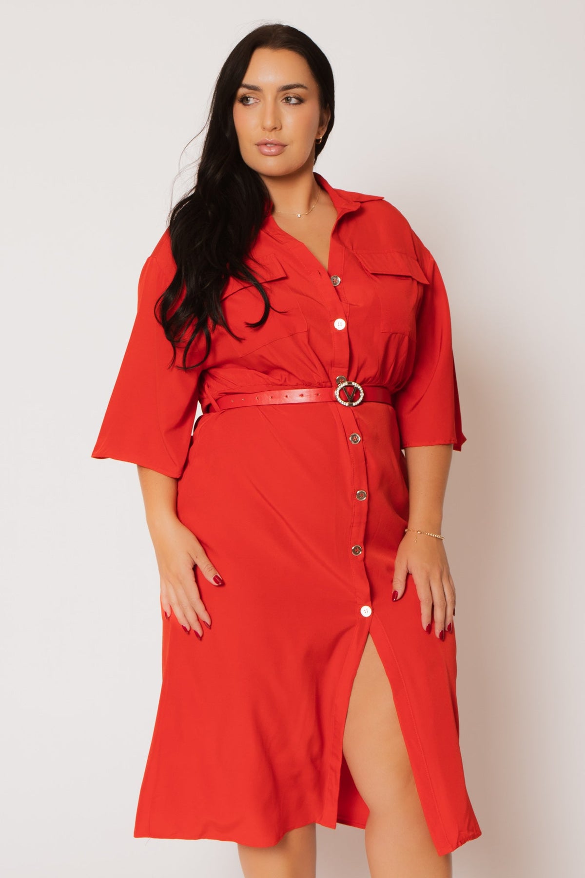 This plus size shirt dress features a collared neckline, button-down front, and wide half sleeves for a relaxed yet polished look. Complete with a matching belt that cinches the waist, it’s the perfect blend of casual comfort and chic style.