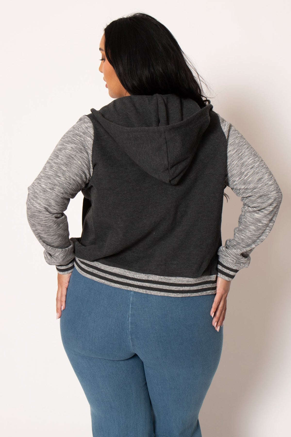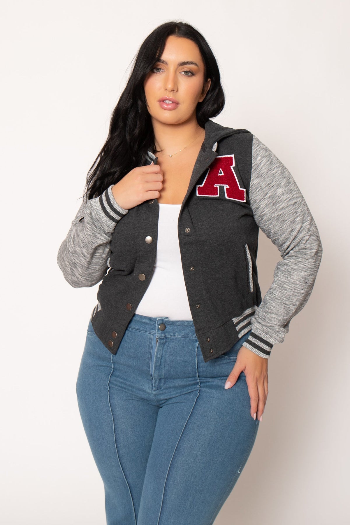 This plus size varsity jacket features contrast heather sleeves, striped ribbed trim, and a bold chenille letter patch for a classic collegiate vibe. Complete with a snap button closure and hoodie detail, it’s the perfect mix of sporty and stylish comfort.