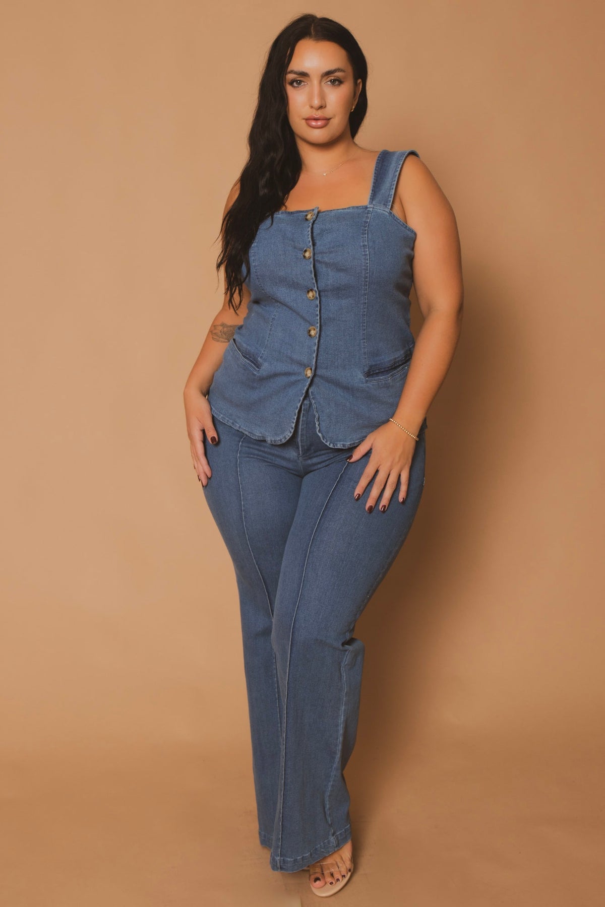 This plus size top features wide straps, a square neckline, and a button-down front for a chic denim look. Designed with a tailored fit and functional pockets, it pairs perfectly with jeans or skirts for effortless style.