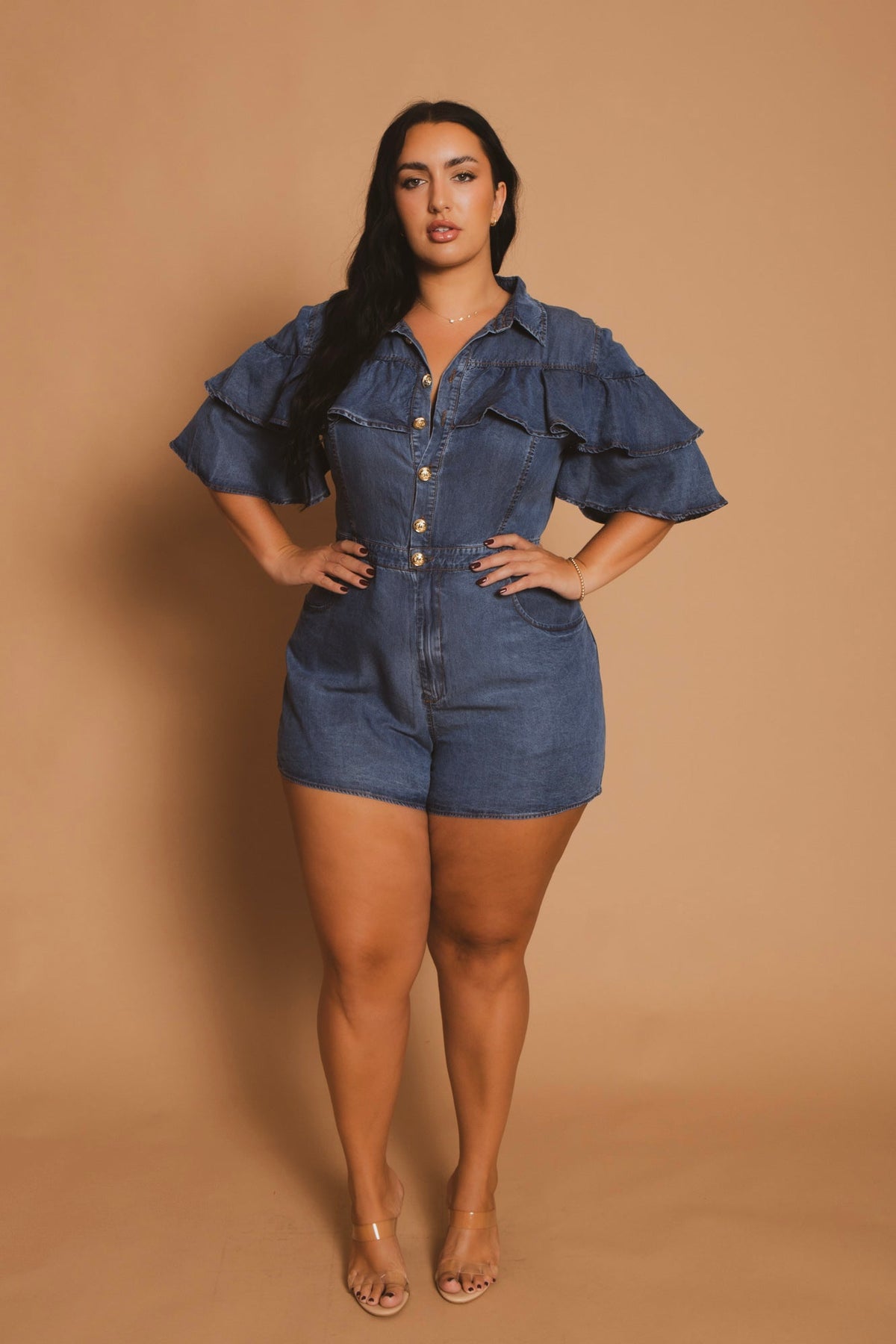 This plus size romper features a classic denim design with a button-down front and ruffled off-the-shoulder sleeves for a chic, feminine touch. Complete with a fitted waist and side pockets, it’s the perfect one-piece for casual days or a stylish night out.