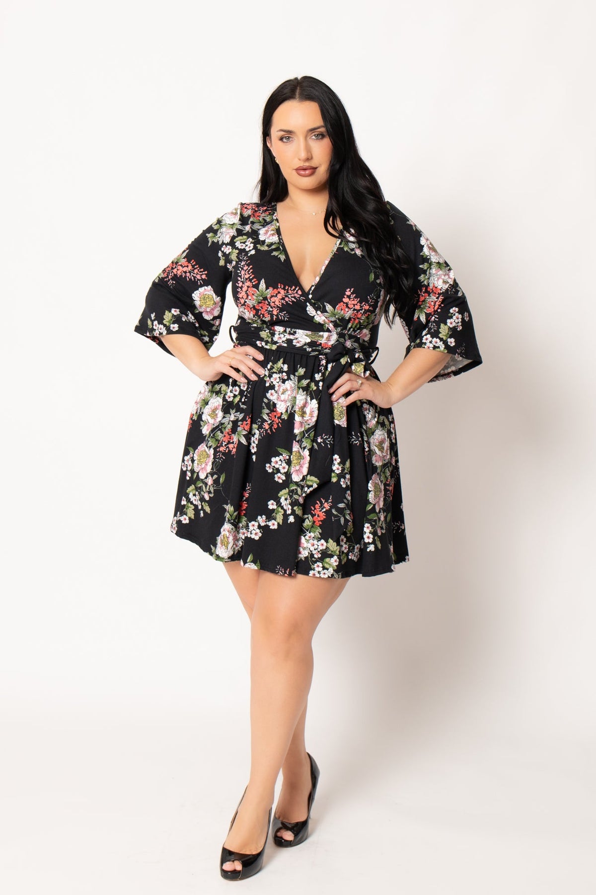 This plus size dress features a flattering surplice neckline with flowy kimono sleeves and an adjustable side tie that cinches the waist for a beautifully defined silhouette. Designed in a vibrant floral print on a classic black backdrop, this flirty mini dress offers effortless movement and the perfect blend of feminine charm and confidence.