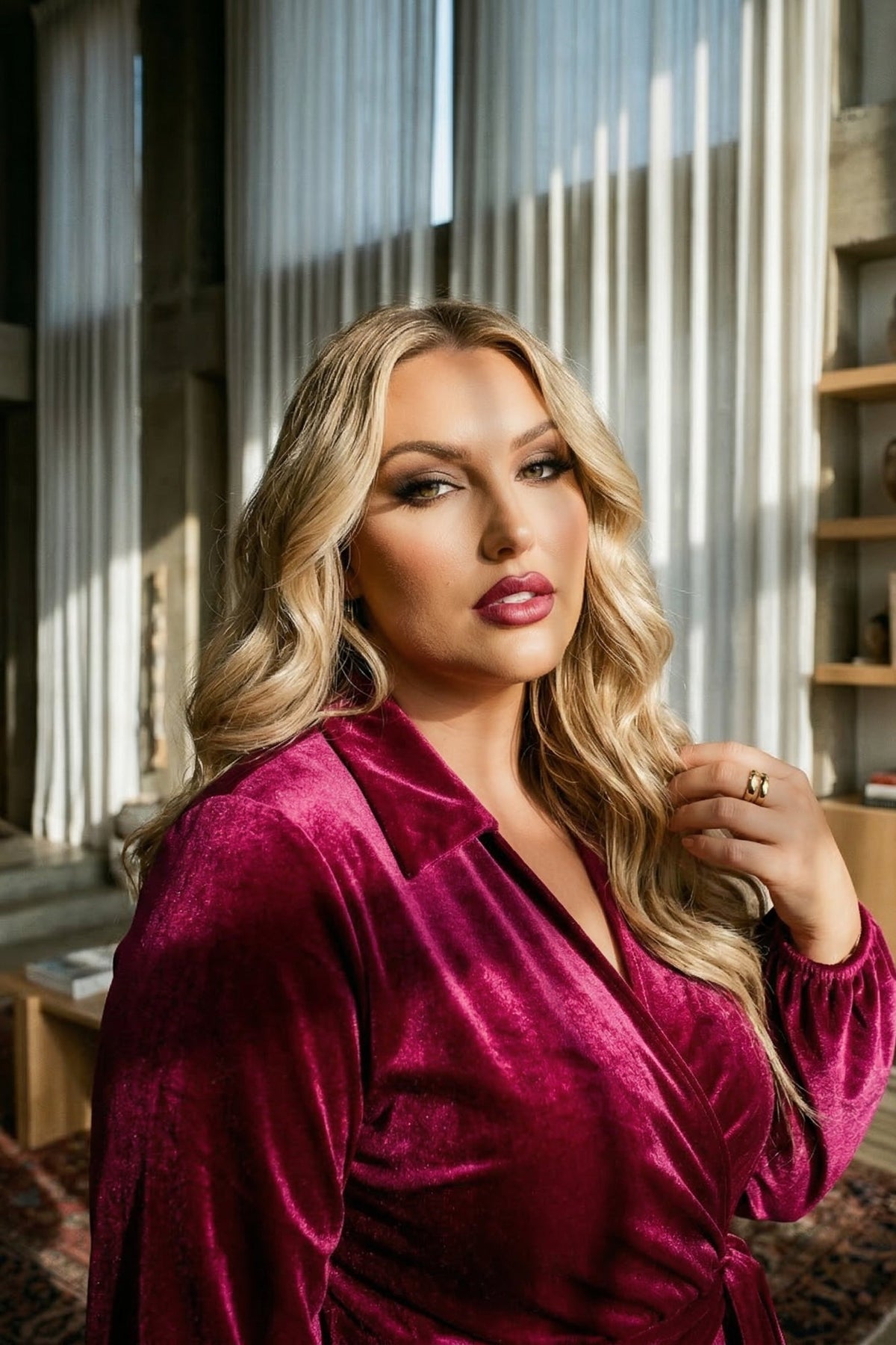 This plus size stretch dress features velour fabric, ,v- neckline, collar, faux button, long sleeve, front shirring, drape detail and a bodycon midi length silhouette.