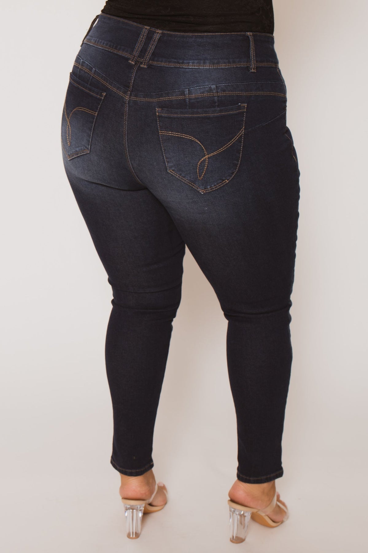 This plus size jean features a high-rise fit with a triple button closure and light distressing for a trendy, lived-in look. Crafted from soft, stretchy denim that hugs your curves, these jeans deliver both comfort and style for everyday wear.