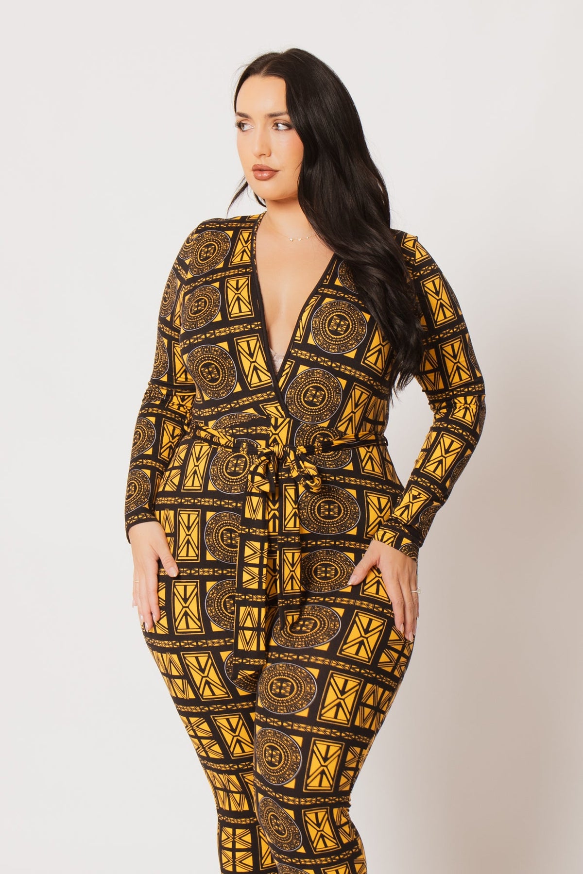 This plus size jumpsuit features a bold geometric print with a flattering surplice neckline and long sleeves for a striking, curve-enhancing look. Designed with a self-tie waist belt and slim-fit legs, it cinches the waist beautifully while providing a sleek and confident silhouette.