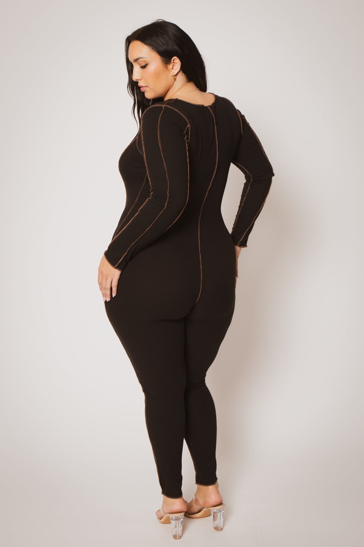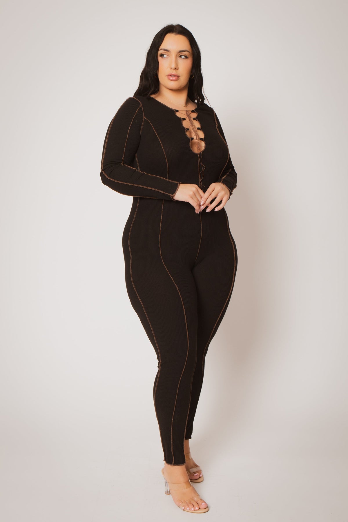 This plus size jumpsuit features a ribbed stretch fabric with a plunging lace-up neckline, long sleeves, and contrast seam detailing that contours and flatters your curves. Designed with a sleek, body-hugging fit and comfortable stretch, it’s the ultimate statement piece for nights out or elevated everyday looks.