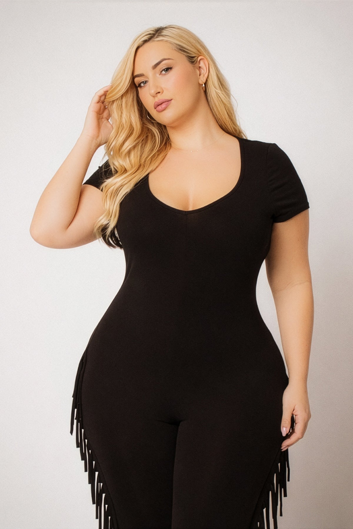 This plus size jumpsuit features a sleek, curve-hugging silhouette with a scoop neckline, short sleeves, and statement fringe detailing along the legs for added movement. Designed in a soft, stretchy fabric with a flattering flare leg, it delivers bold, confident style perfect for nights out or standout moments.