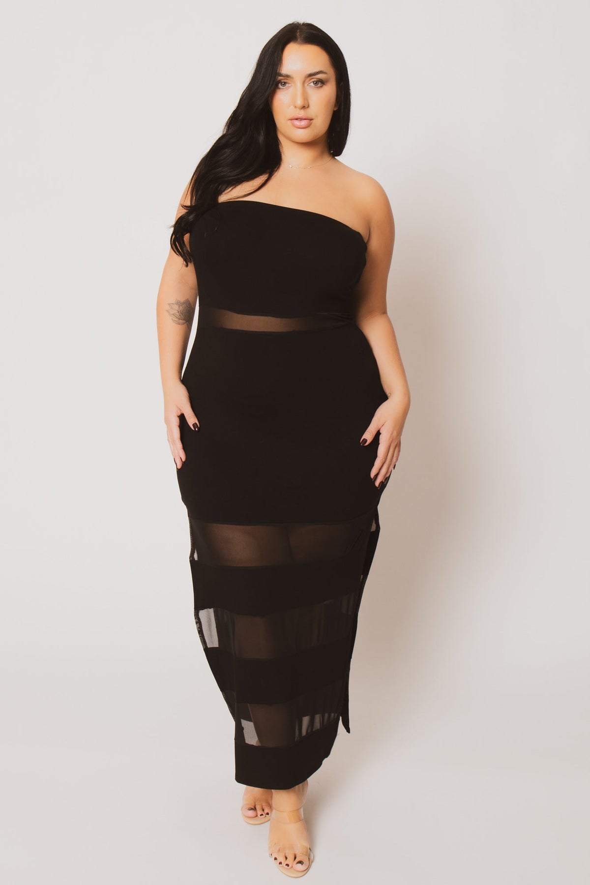 This plus size dress features a strapless neckline with a sleek bodycon fit that highlights your curves. Designed with sheer mesh paneling and side slits, it adds a bold, modern edge perfect for a night out.