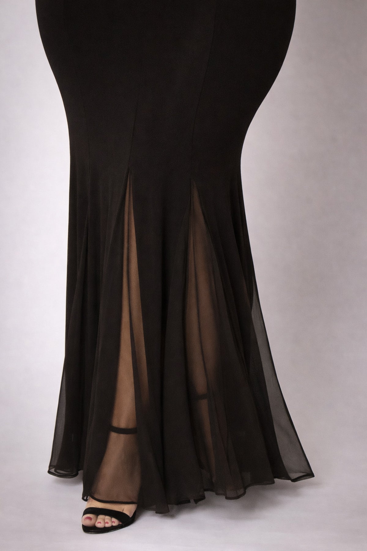 This plus size dress features a halter neckline with a deep mesh plunge that creates a bold, sculpted silhouette. Finished with a flowing mermaid hem and sheer insets, it delivers dramatic movement perfect for evening moments.