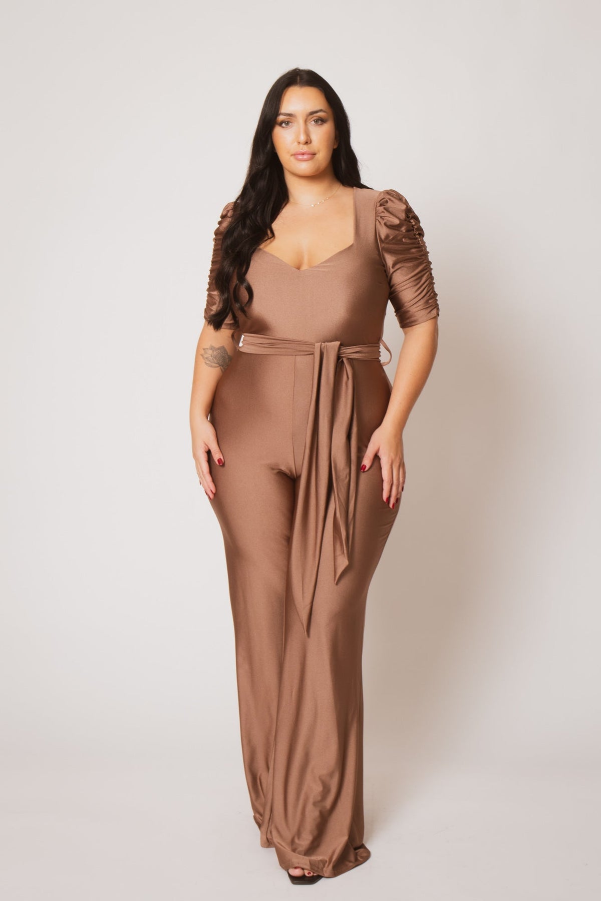 This plus size jumpsuit features a flattering sweetheart neckline with ruched sleeves and a soft, stretch fabric that hugs your curves comfortably. Finished with a wide self-tie belt and flowy flared legs, it delivers an effortlessly elegant, elongated silhouette.