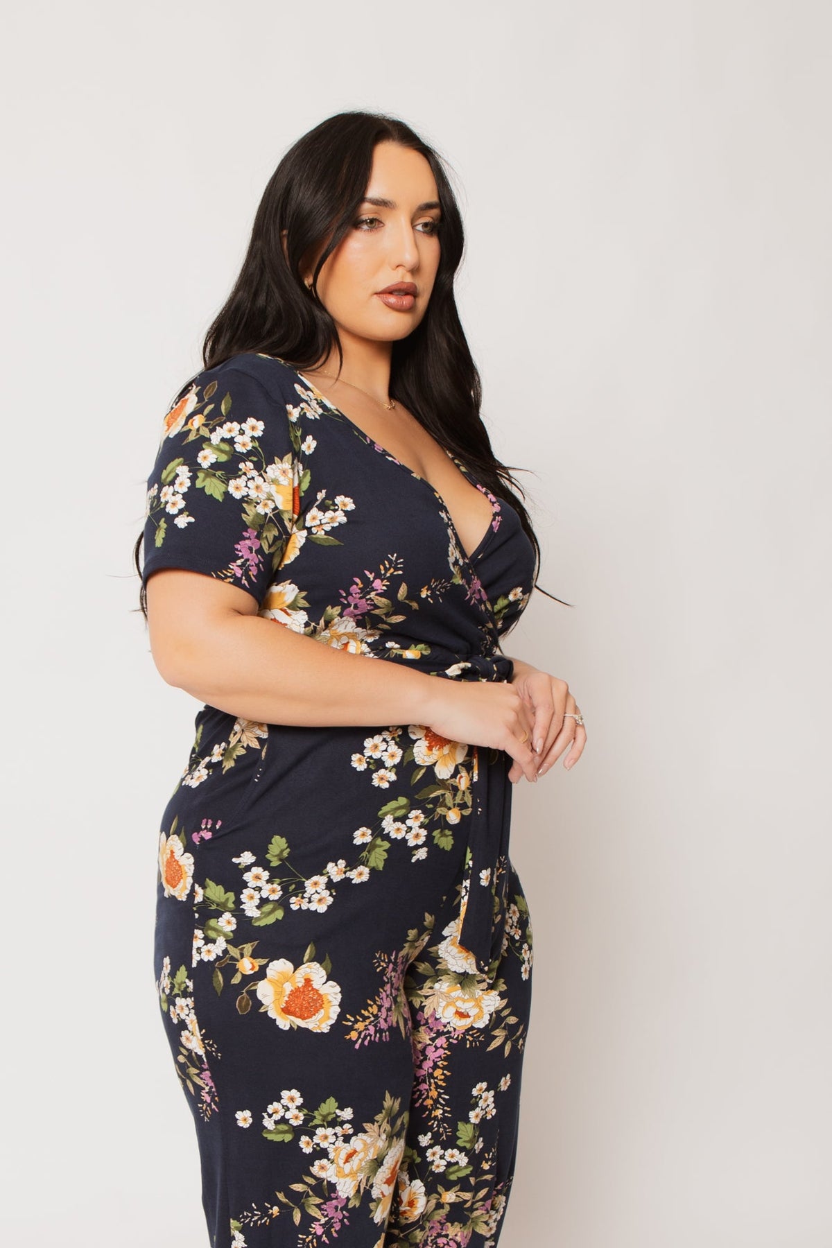 This plus size jumpsuit features a flattering wrap-style bodice with a deep V neckline, short sleeves, and a self-tie waist that accentuates your curves beautifully. Designed in a romantic floral print with relaxed jogger-style legs and elastic cuffs, this one-piece look blends effortless comfort with feminine charm.