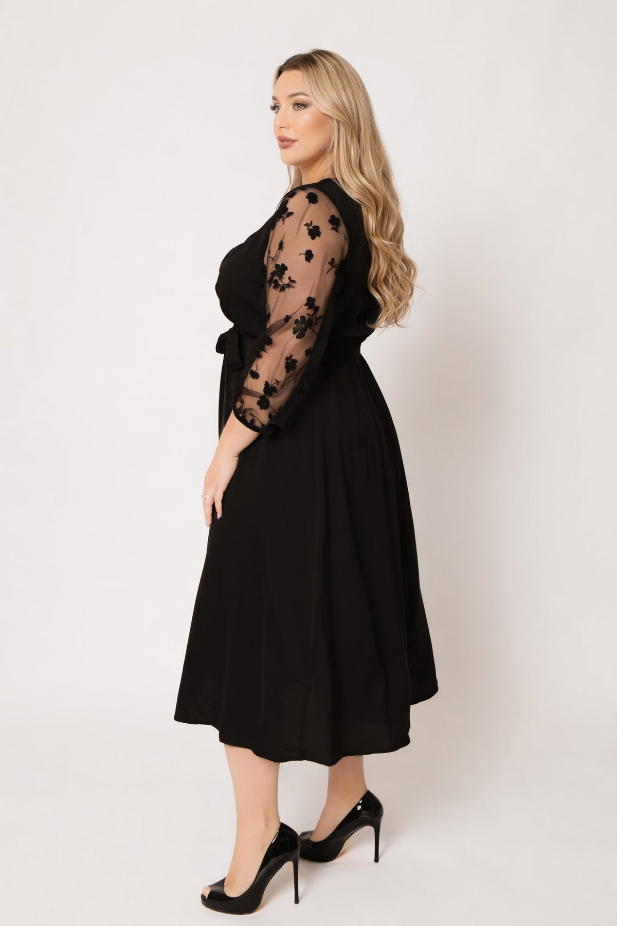 This plus size dress features a flattering surplice neckline with sheer floral embroidered sleeves and a self-tie waist that beautifully defines your curves. Designed with a flowy midi-length skirt and elegant lightweight fabric, this timeless black style brings romantic sophistication perfect for special occasions or evening elegance.