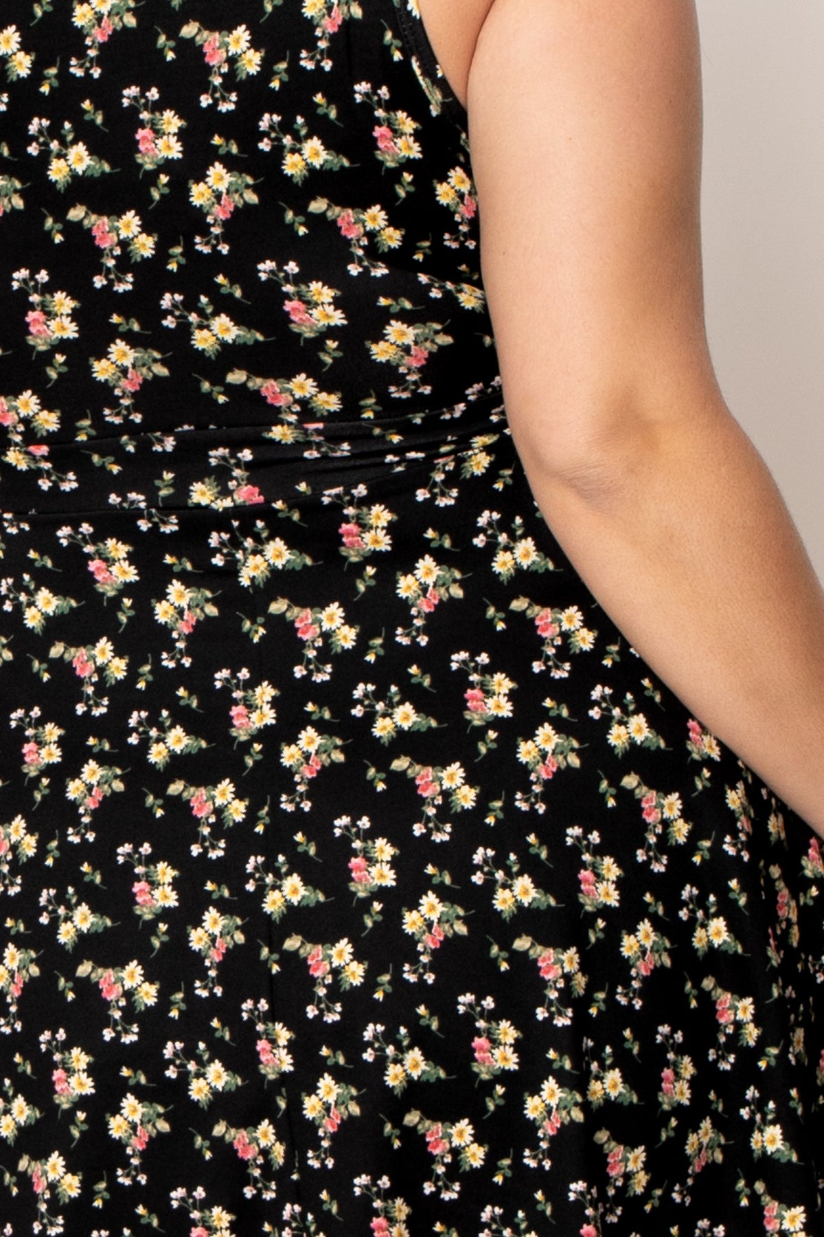 This Plus Size dress features a v-neckline, sleeveless cut, pockets, and a fun flare silhouette, perfect for warm-weather days. The vibrant retro floral print adds a playful, vintage-inspired charm to your look.