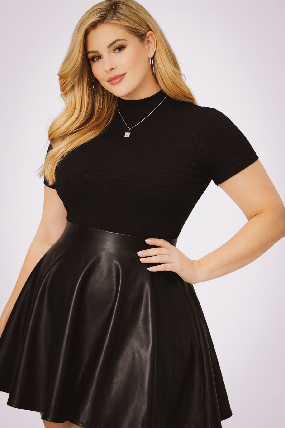 This plus size dress features a fitted ribbed bodice with a mock neckline, short sleeves, and a back zipper for easy wear. Finished with a high-waisted faux leather skater skirt, it creates a flattering silhouette perfect for nights out or elevated everyday looks.