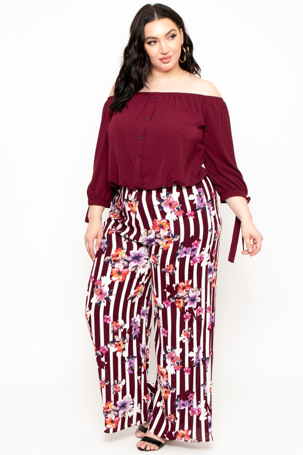 This plus size, stretch woven pants feature an allover floral print, an elasticized waist, a high rise, and wide leg.