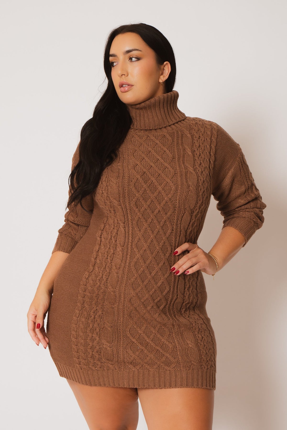 This plus size sweater dress features a cozy cable knit design, a slouchy turtleneck, and long sleeves for ultimate comfort. Perfect as a mini dress or layered with tights and boots, it’s a versatile piece that keeps you chic and warm.