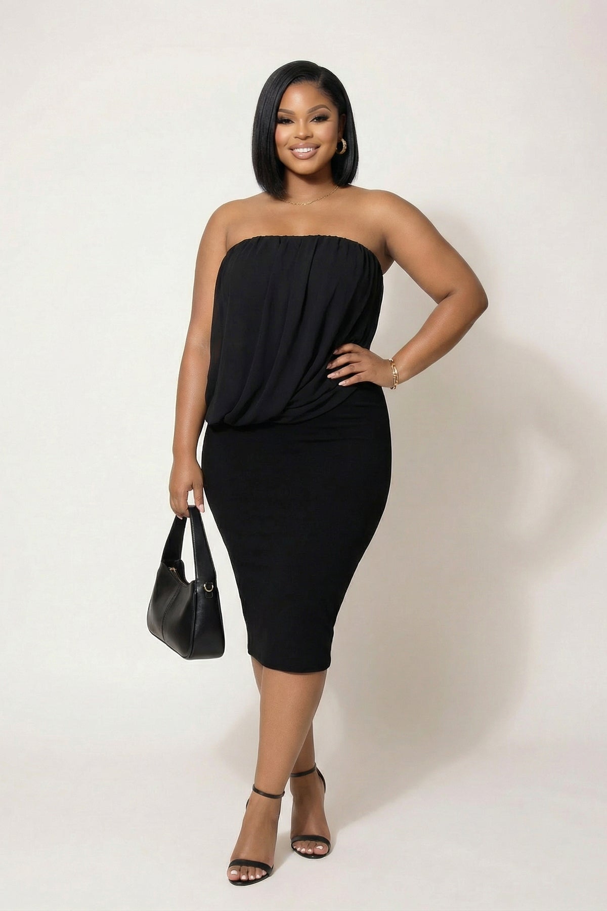 This plus size dress features a strapless neckline with a softly draped chiffon overlay that adds elegant movement and flattering coverage. Designed with a smooth, curve-hugging midi silhouette, it’s a timeless choice for special occasions, date nights, or evening events.