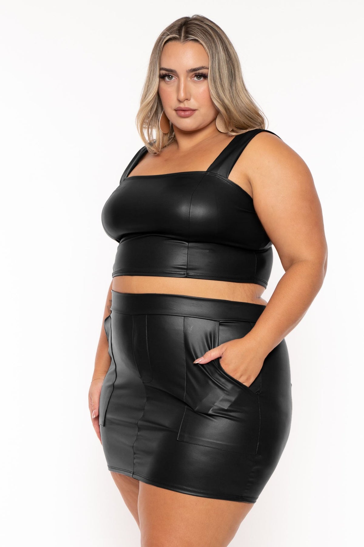 This ensemble, designed for plus-sized individuals, includes a crop top with a straight neckline, wide straps, and a high-waisted mini skirt with pockets, crafted from a supple faux leather fabric.