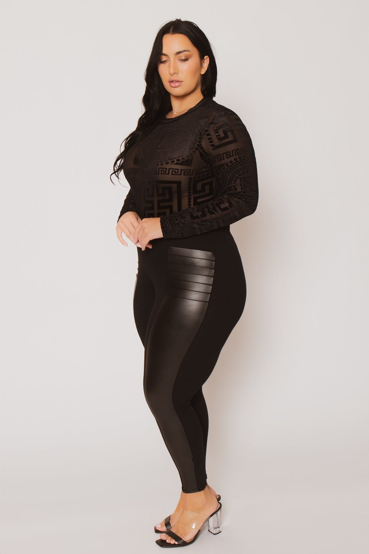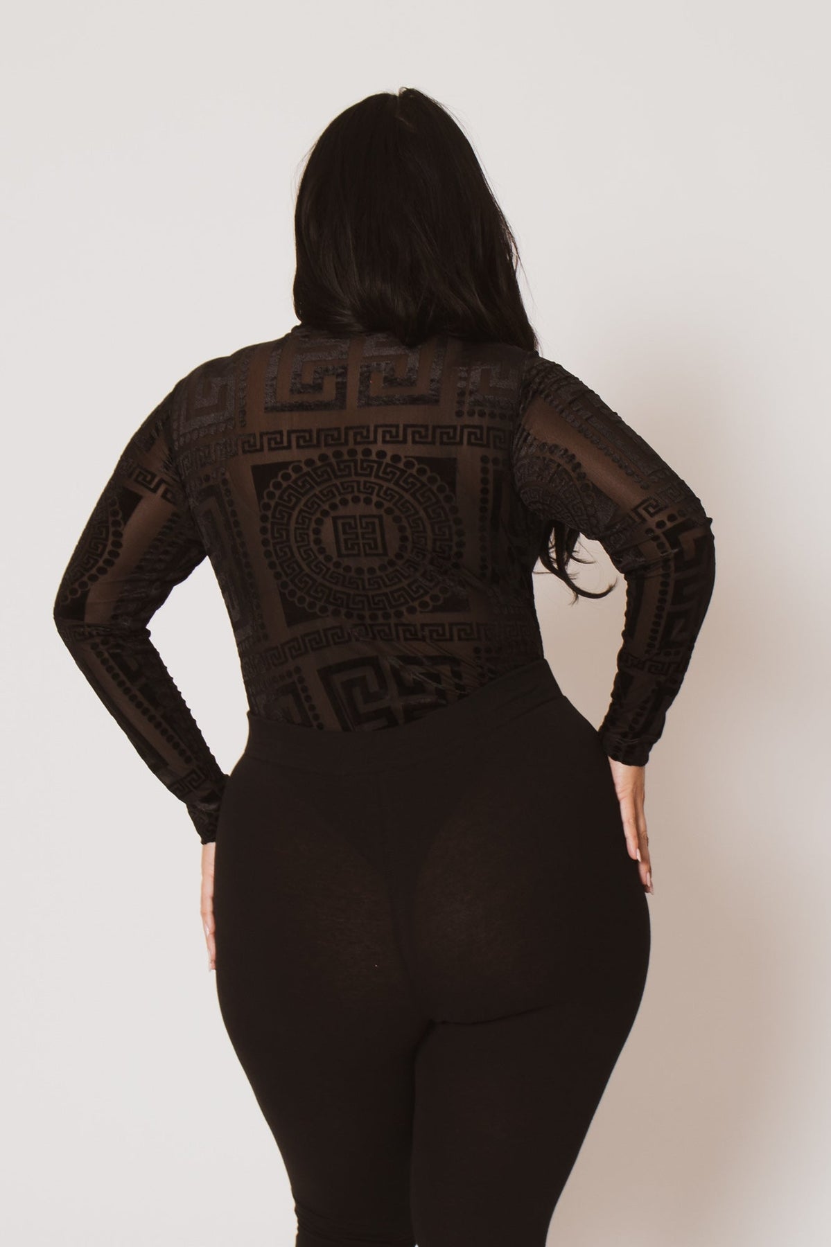 This plus size bodysuit features a sheer mesh design with a bold velvet geometric pattern and long sleeves for a sleek, modern look. Finished with a convenient snap button closure, it’s perfect for pairing with high-waisted pants or skirts for a night-out statement.