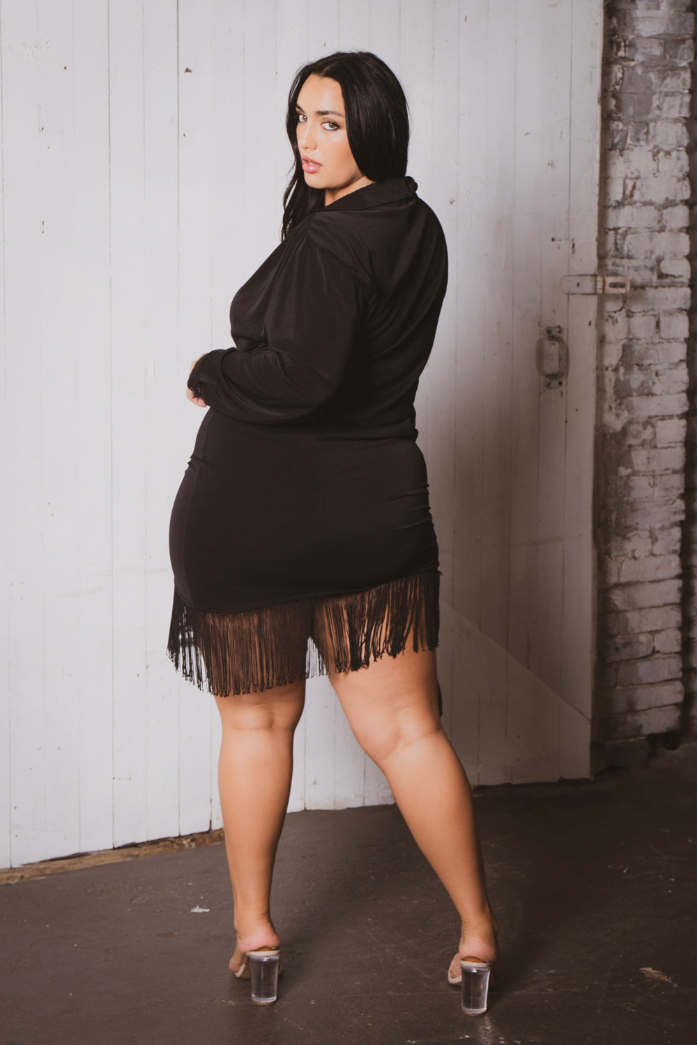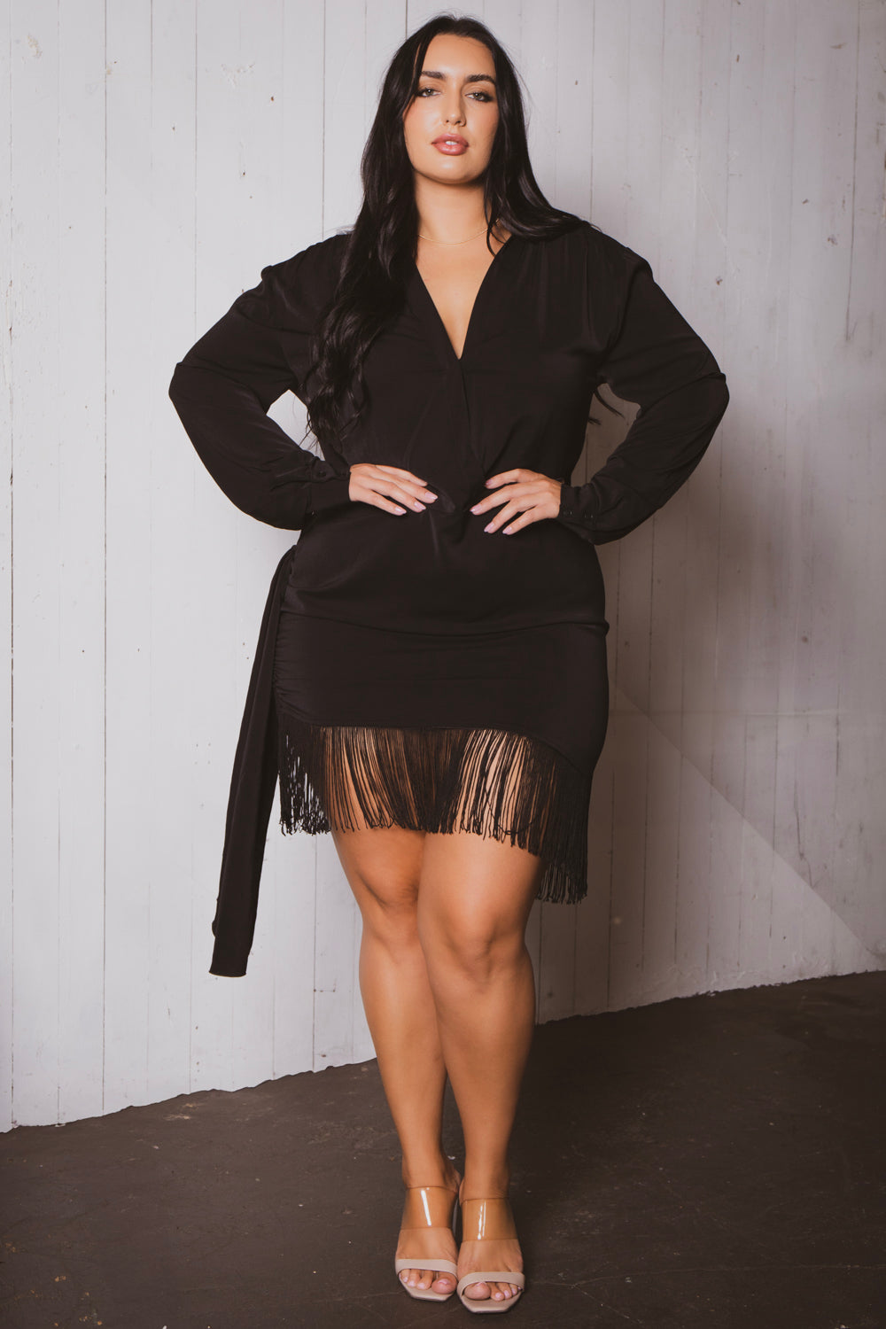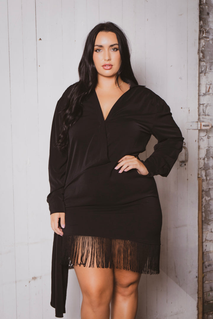 This plus size fringe mini dress features a soft stretch fabric with a deep V-neckline and long sleeves for a sultry silhouette. Finished with asymmetrical draping and playful fringe trim at the hem, it brings flirty movement and bold flair to your night-out look.