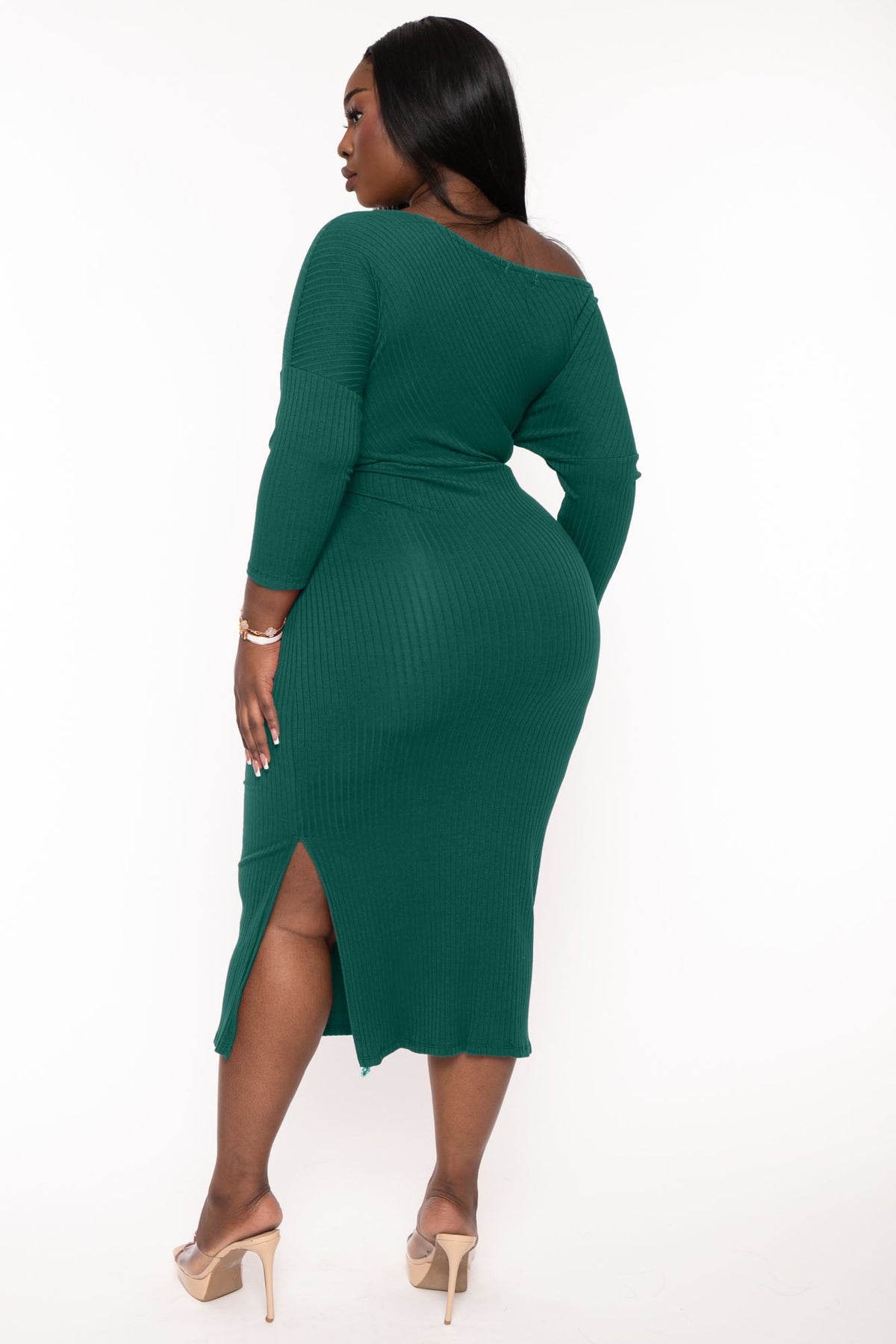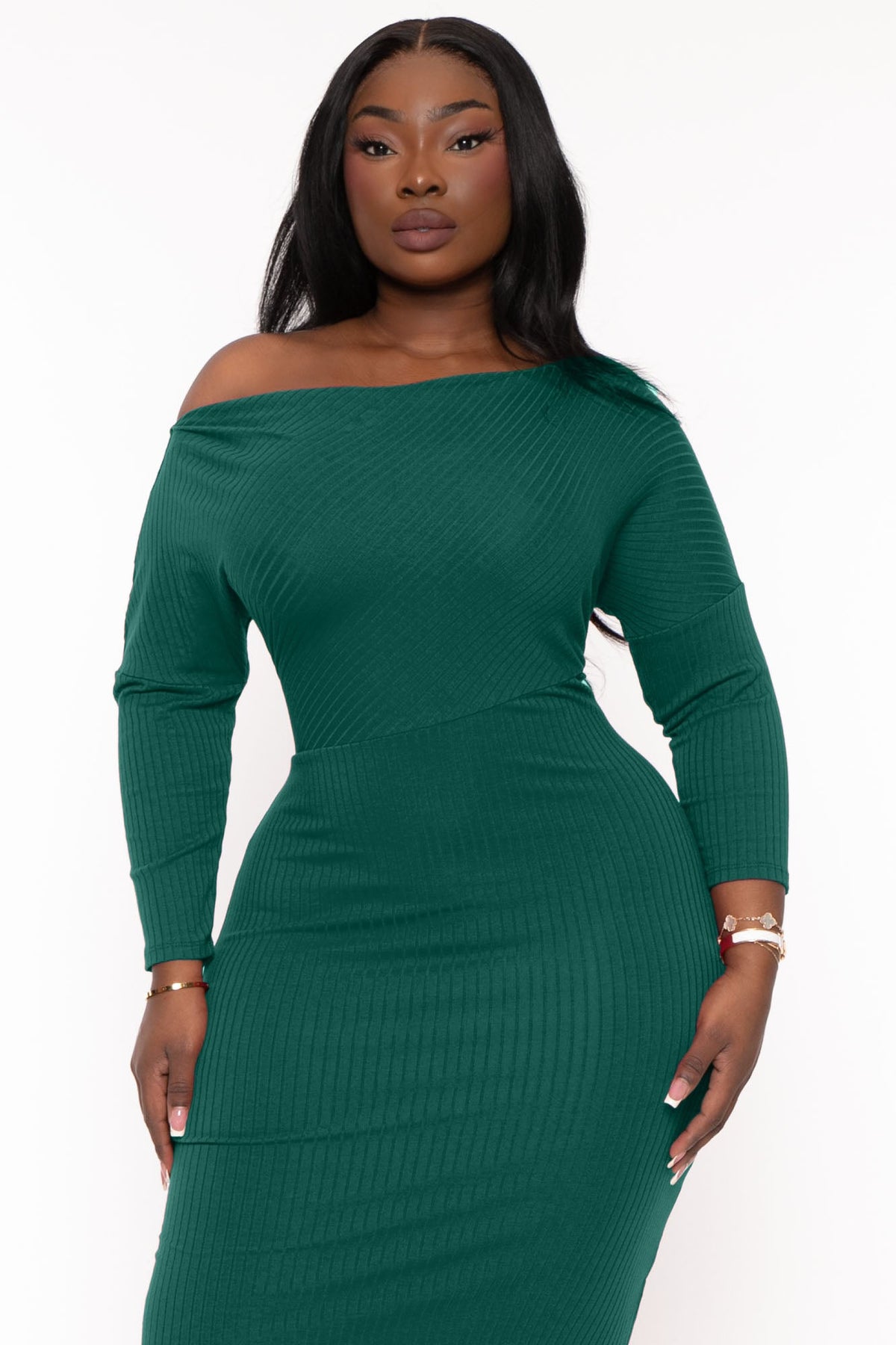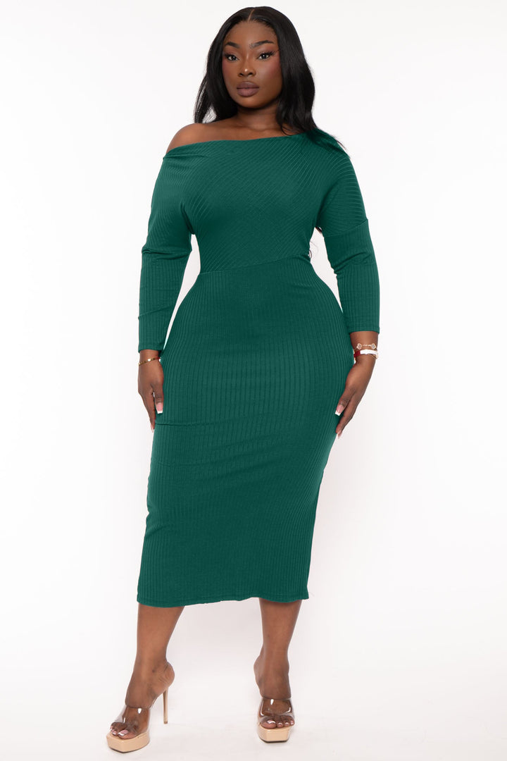 This plus size stretch ribbed dress features an off the shoulder neck, dorman sleeves, in a midi silhouette.