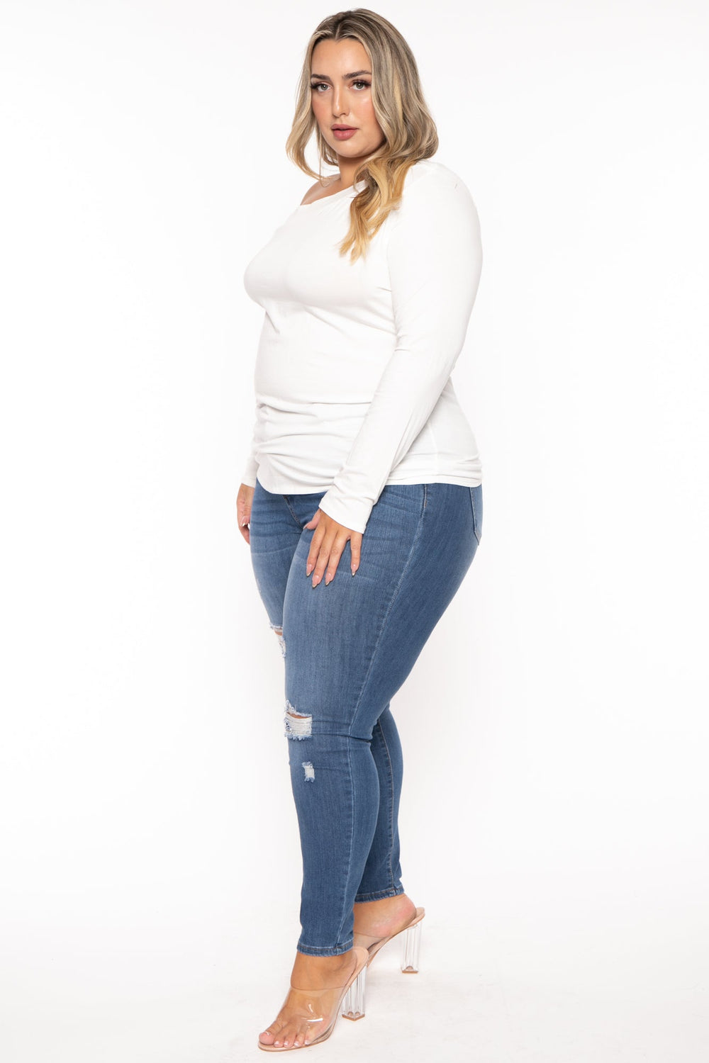 This plus size woven top features off the shoulder neck, long sleeves in asymmetric cut.
