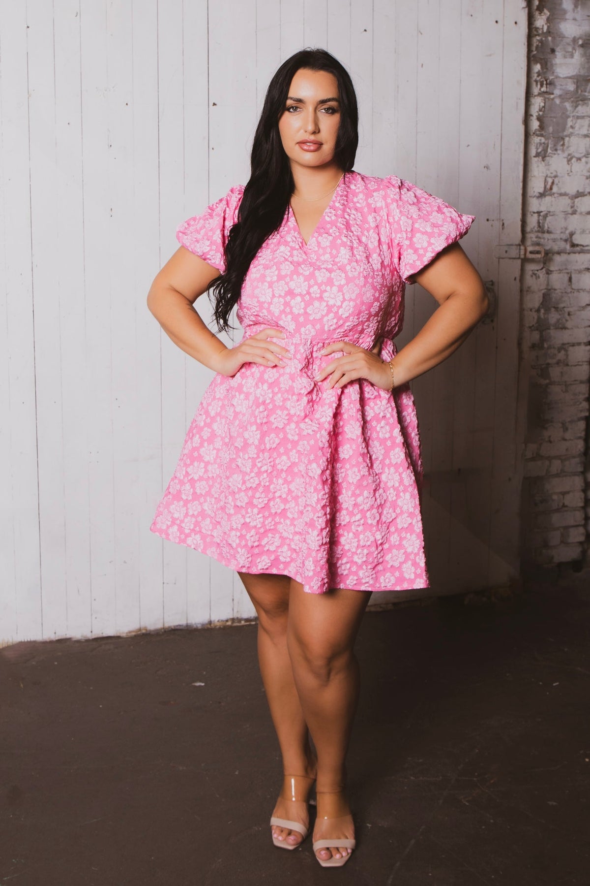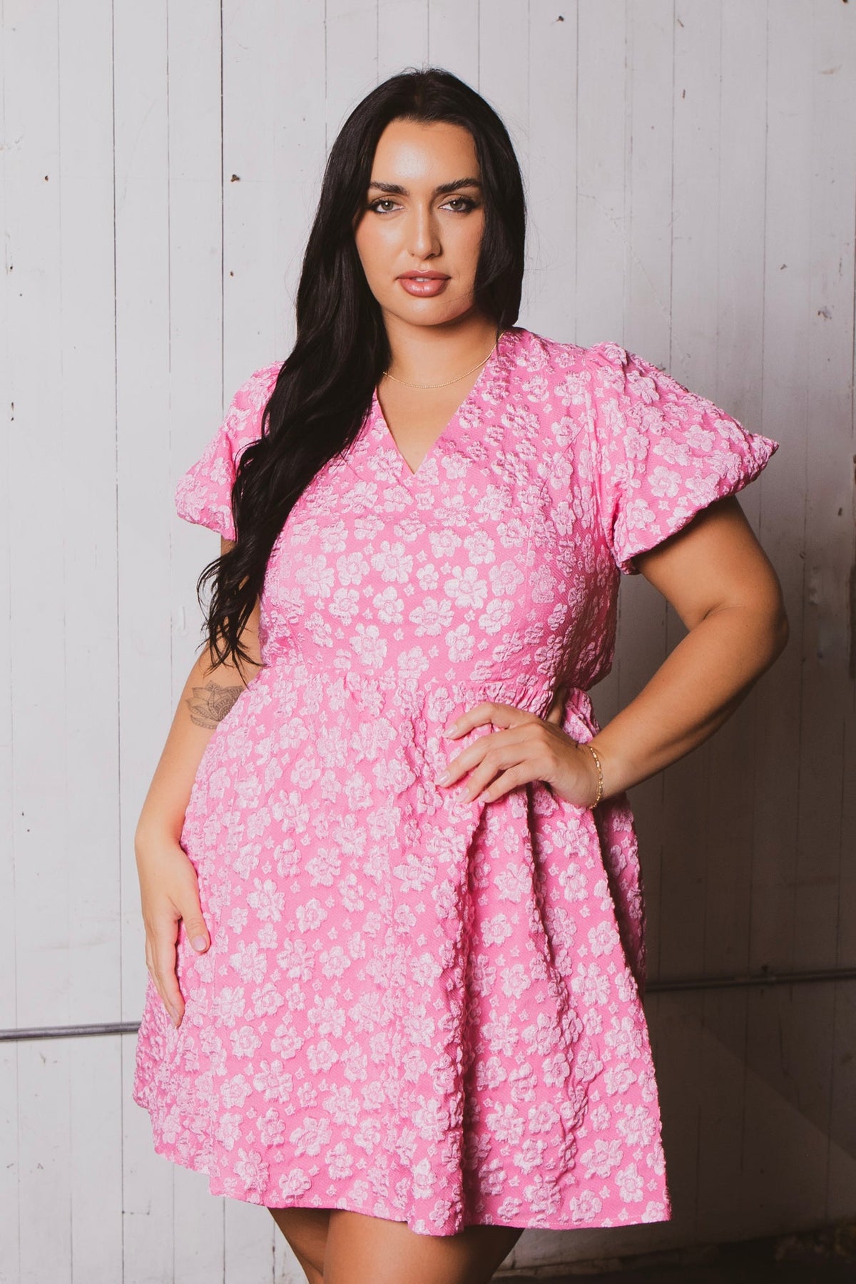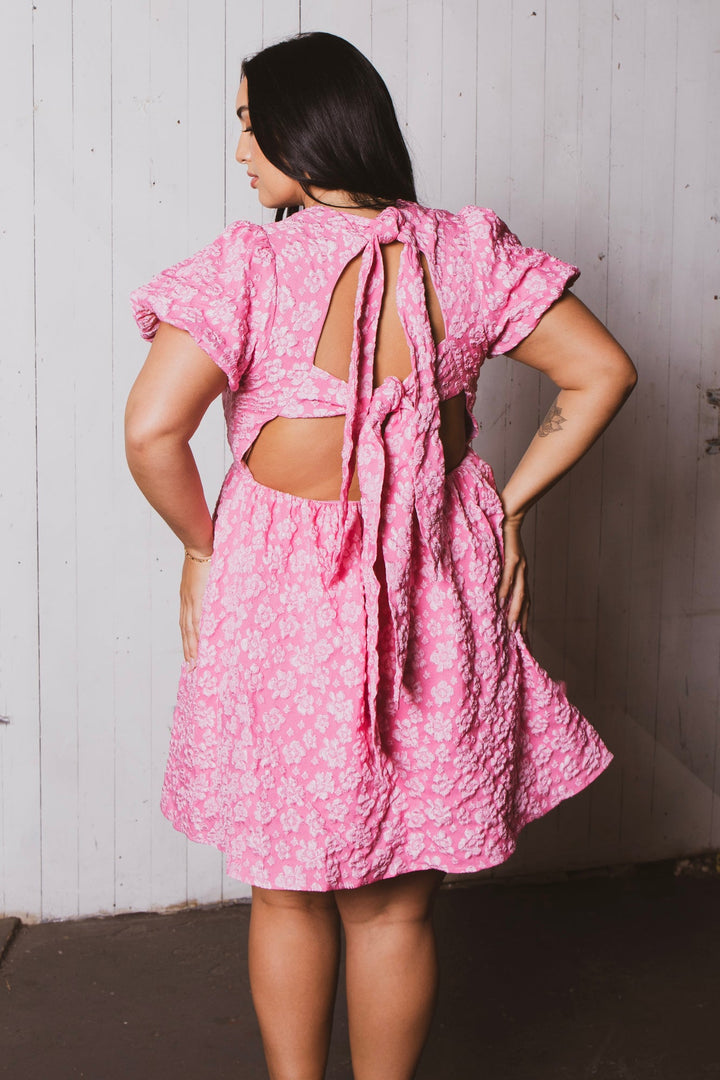 This plus size dress features a textured floral jacquard fabric, short puff sleeves, and a flattering V-neckline. The back steals the show with flirty cutouts and dual bow ties for a playful, feminine finish.