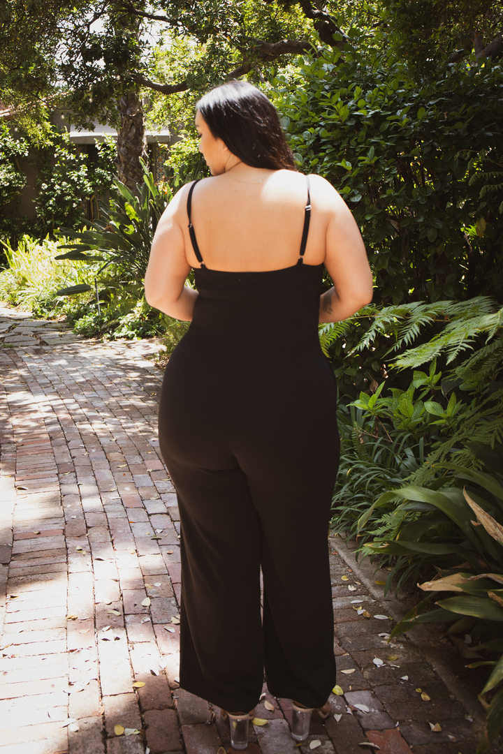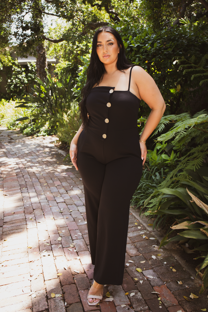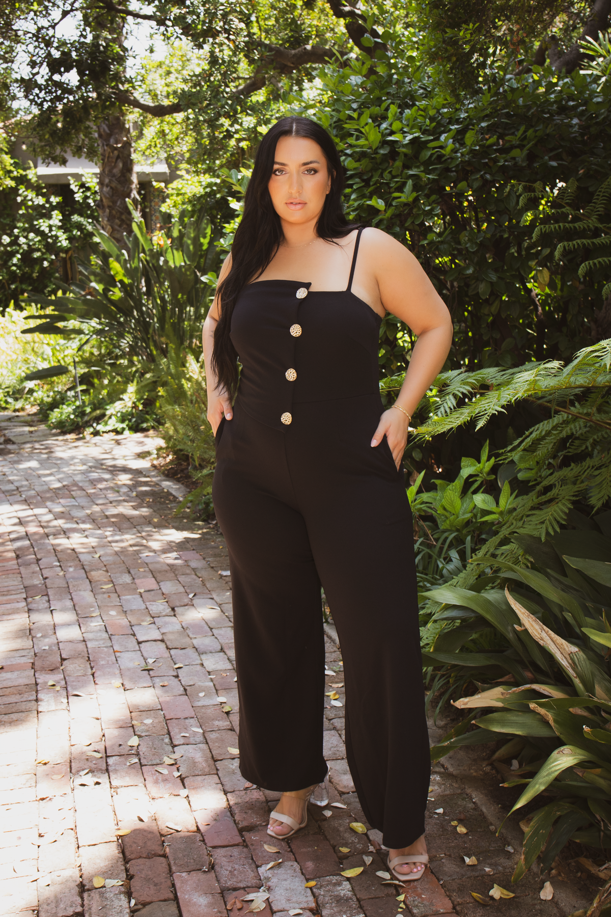 This Plus Size jumpsuit features a straight neckline, spaghetti straps, a stylish asymmetrical button-down front, and functional pockets. The wide-leg silhouette and crisp white fabric make it a chic choice for any occasion.