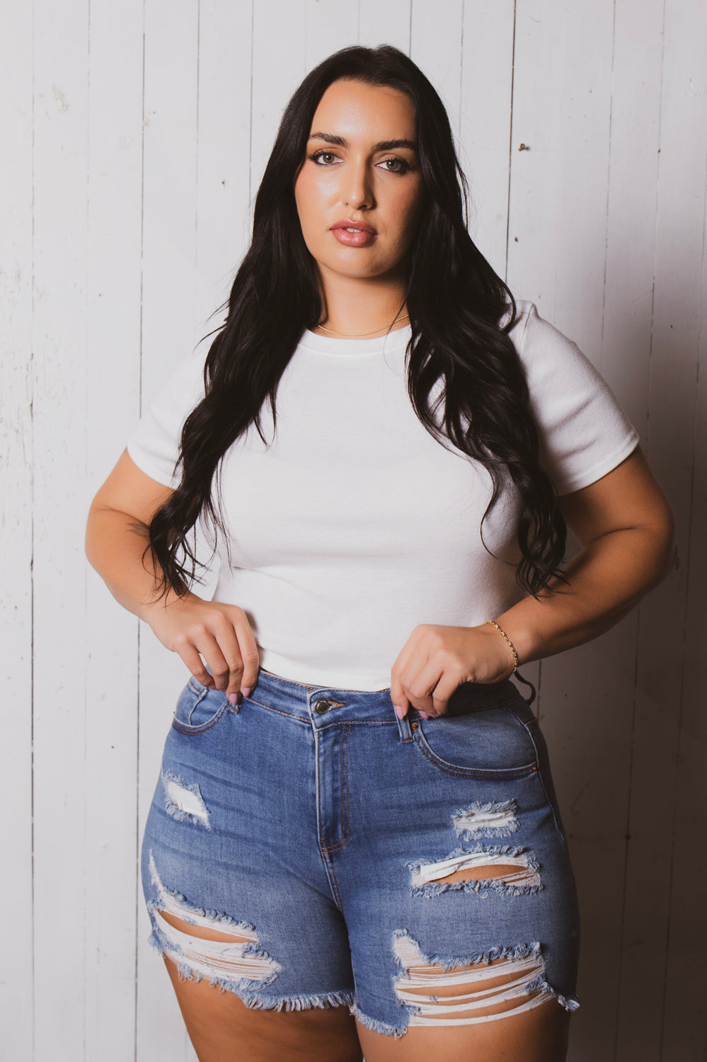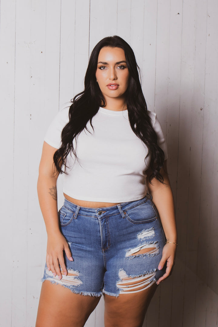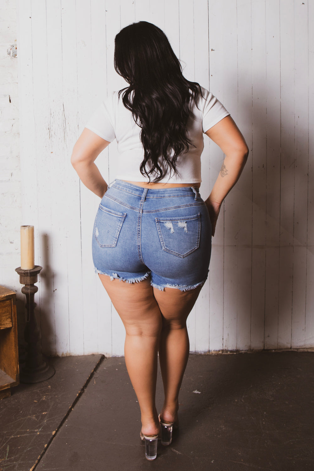 This plus size, stretch shorts features, zip up button closure, five pockets, destroyed thought out and fray hem