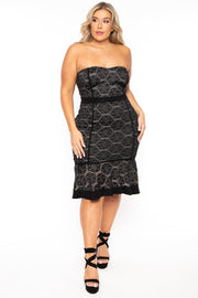 This plus size stretch dress features an all over embroidered lace detail, an elasticized strapless neckline, sleeveless, banded waist, ruffle bottom hem and a bodycon midi length sillouhete.