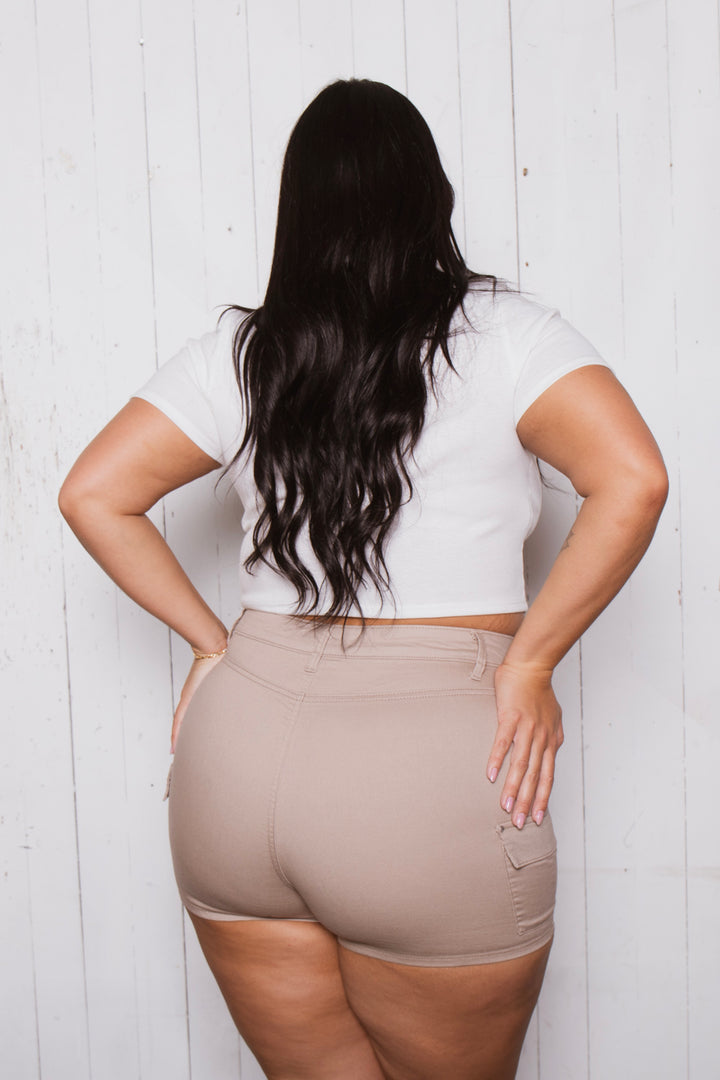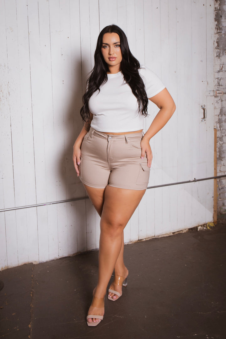 This plus size short features a sleek, solid black design with stretch fabric that hugs your curves in all the right places. Finished with functional side cargo pockets and a clean hem, it’s a versatile staple perfect for everyday wear.