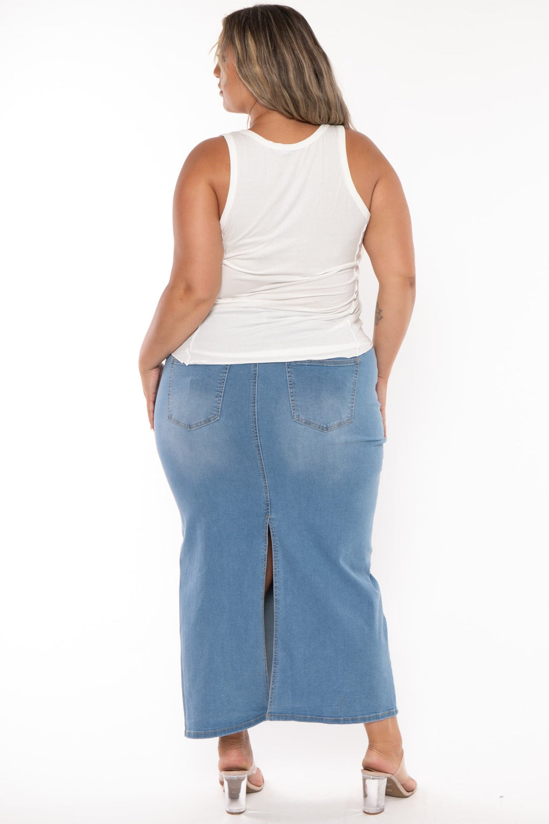 This plus size, tank top features a notch v neckline, sleeves cut, inside out seem detail,