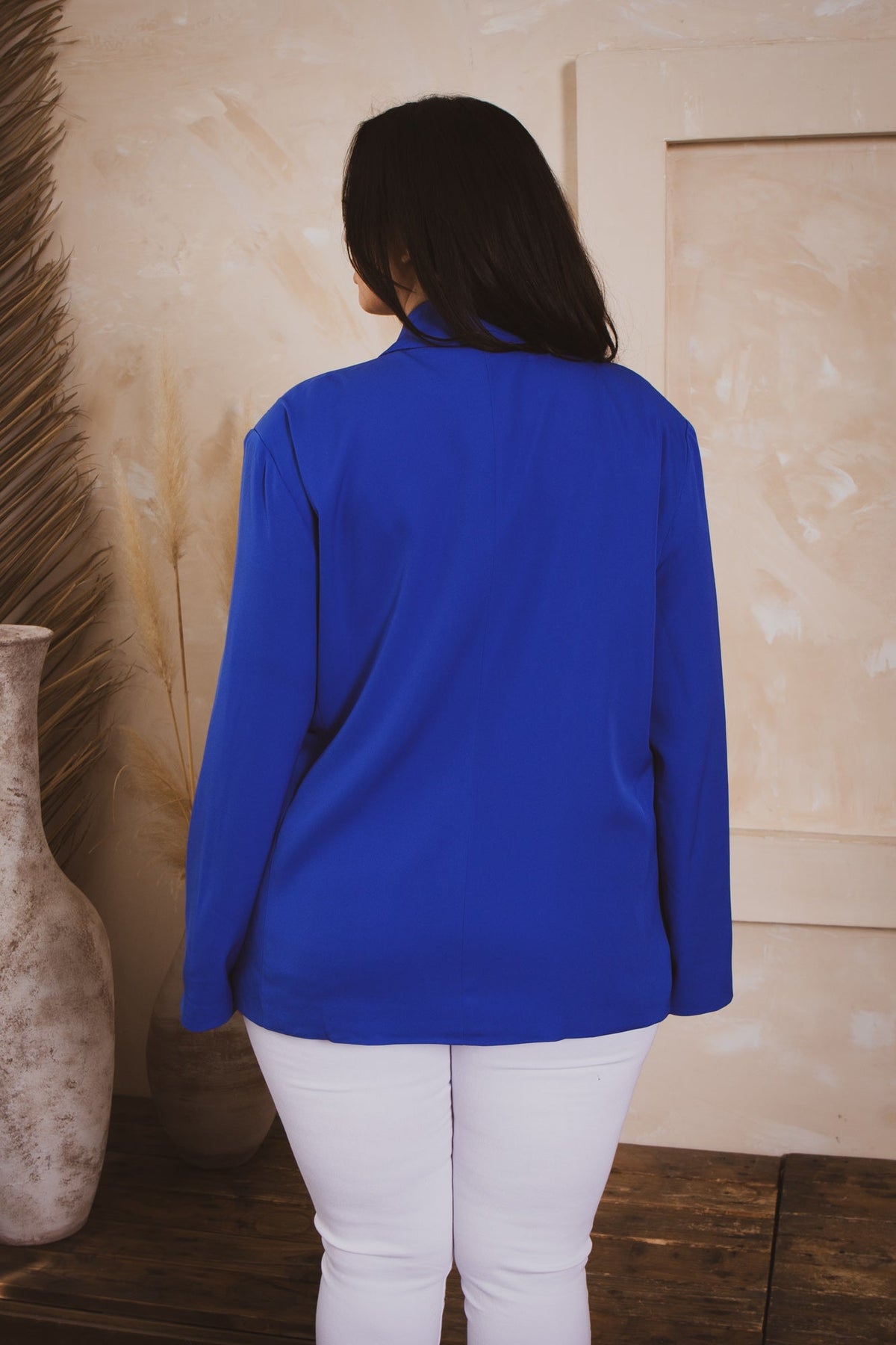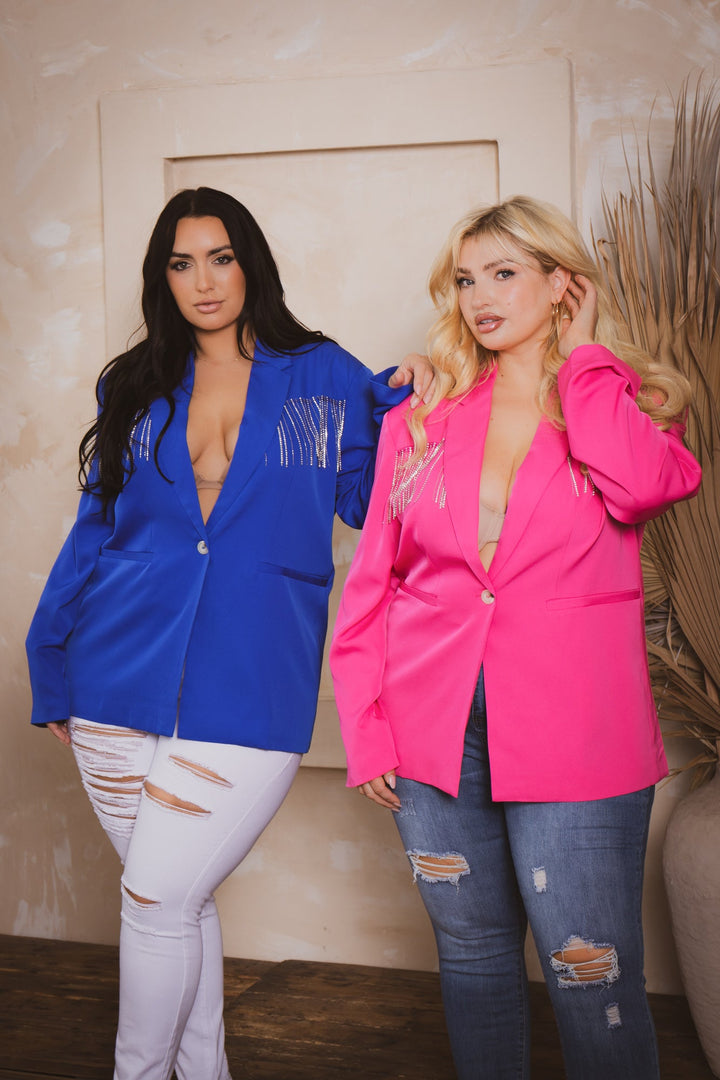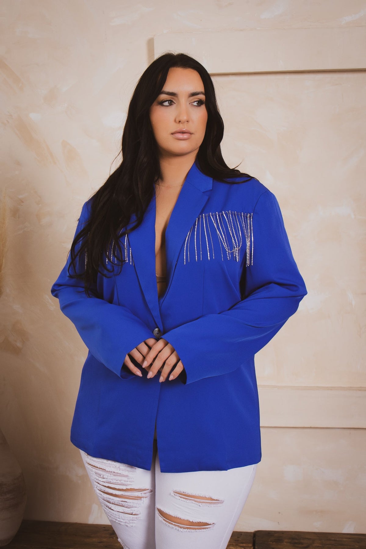 This plus size, blazer features an rhinestone fringe detail, notched lapels, one button closure, faux pockets, long sleeves, fully lining.