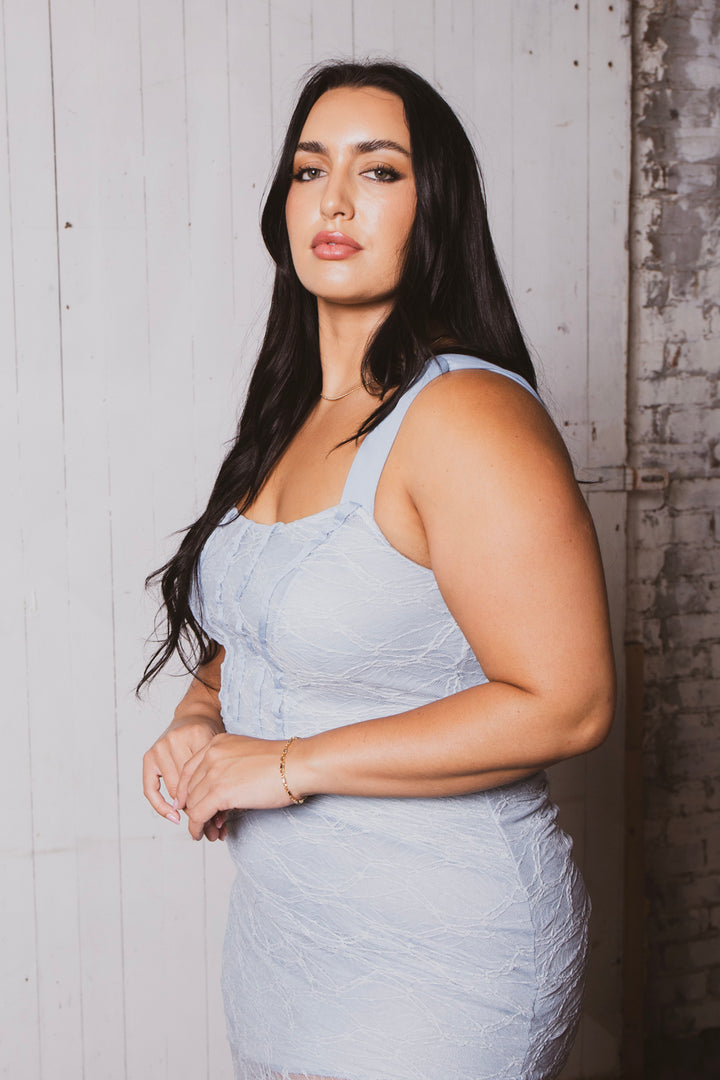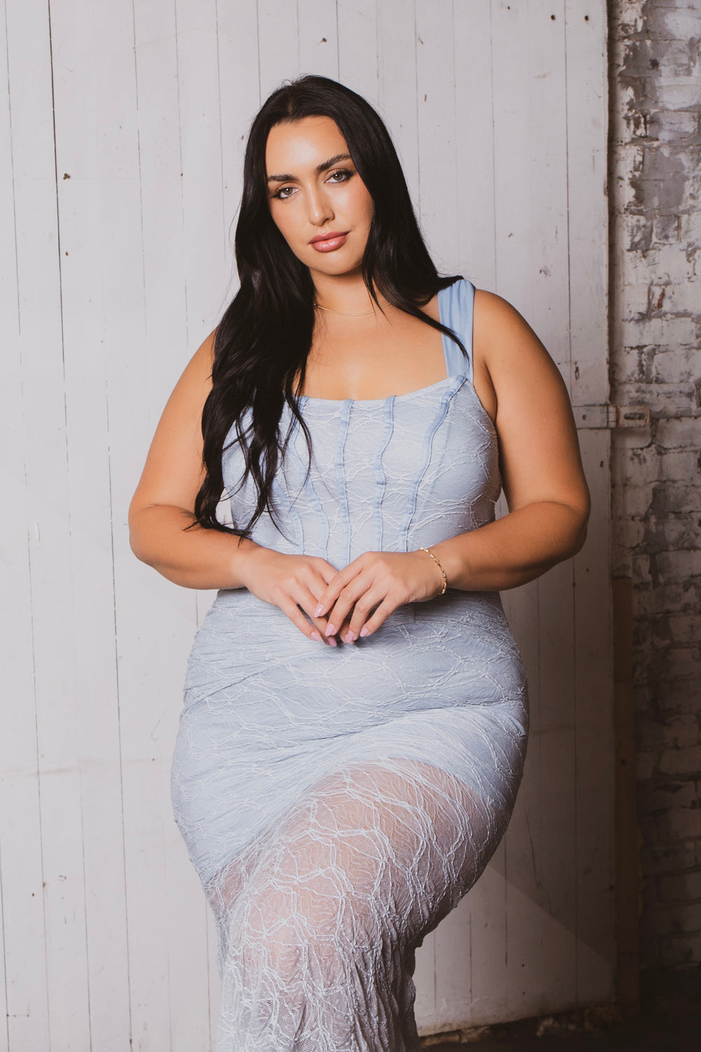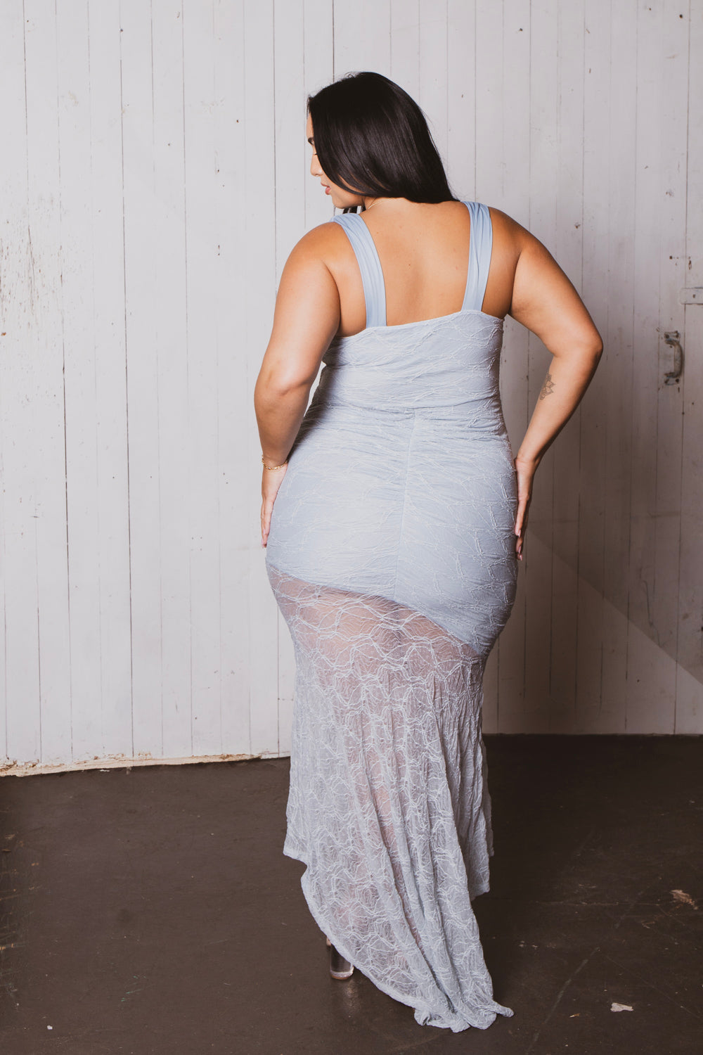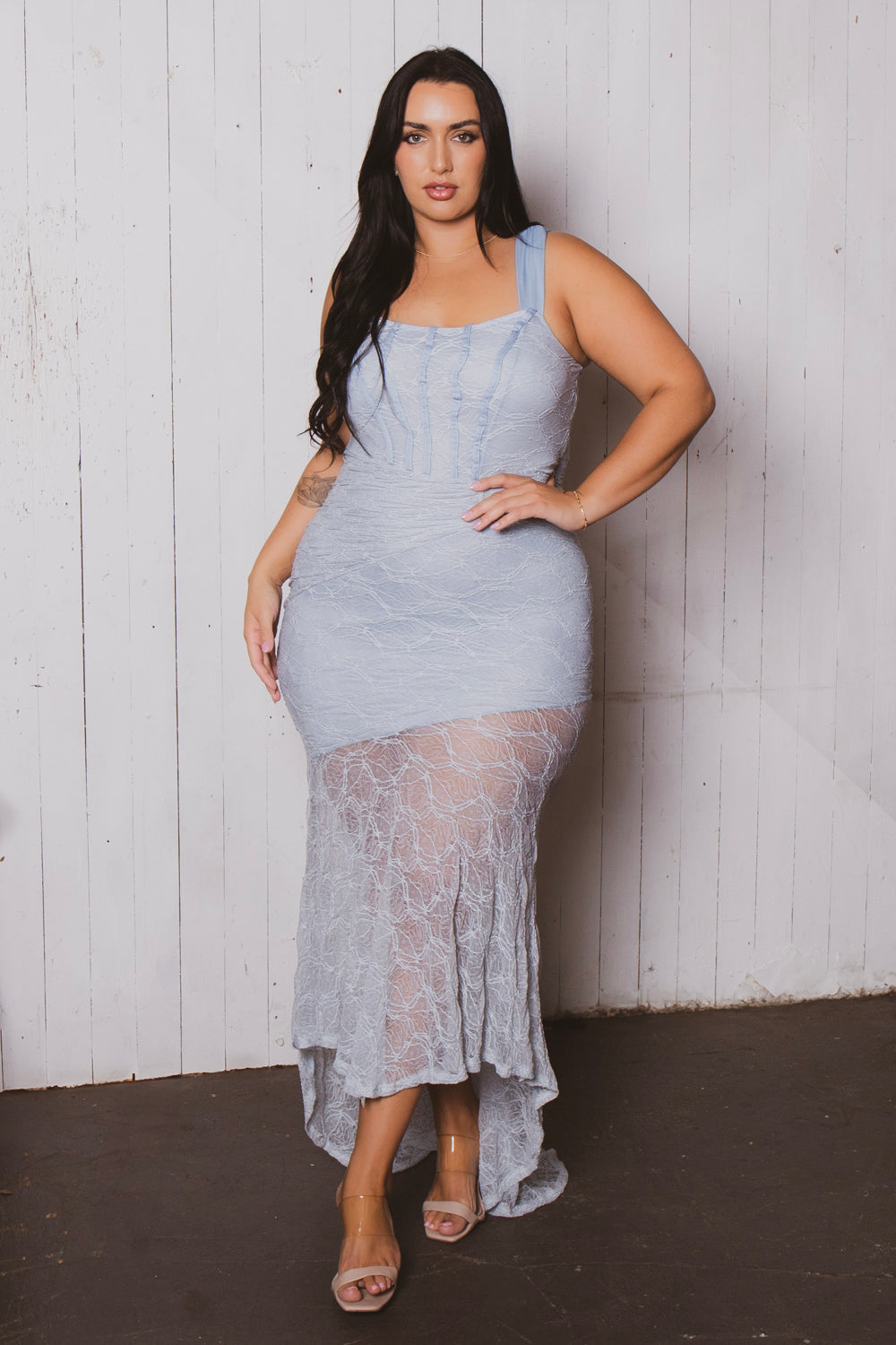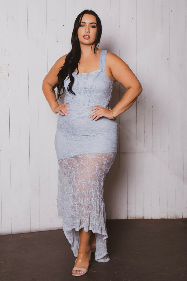 This plus size lace dress features a corset-inspired bodice, thick straps, and delicate ruching throughout for a flattering silhouette. The sheer lace high-low hemline adds a touch of romance and ethereal elegance to the overall look.