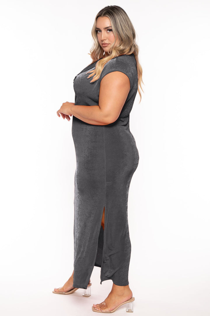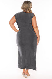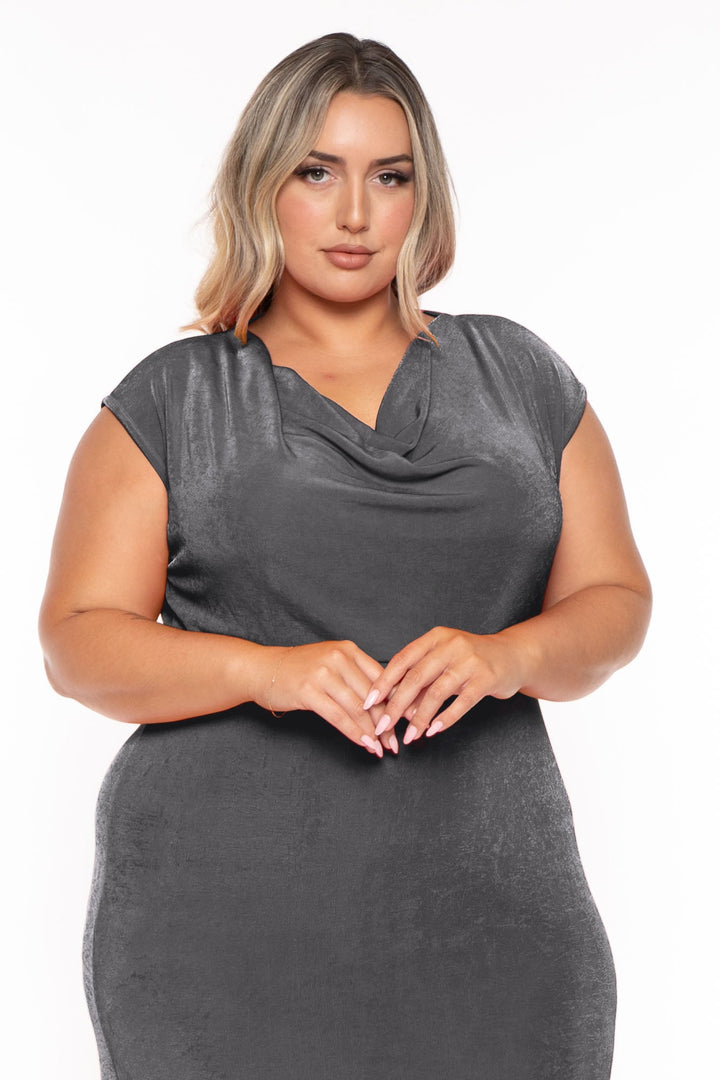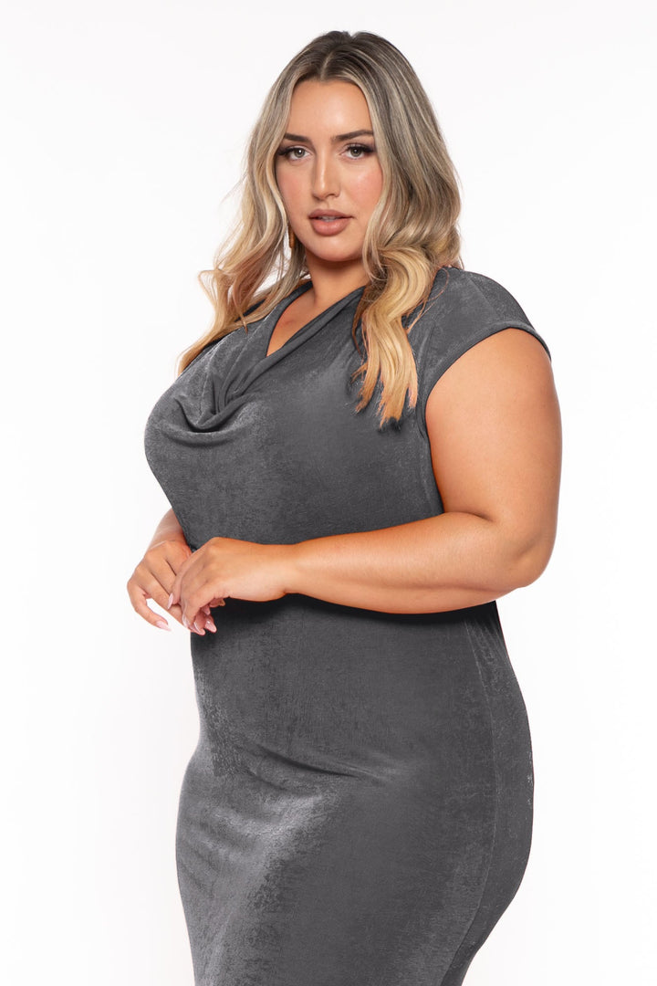 This Plus Size Maxi dress features a cowl neck, sleeveless cut, slit in a maxi silhouette