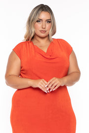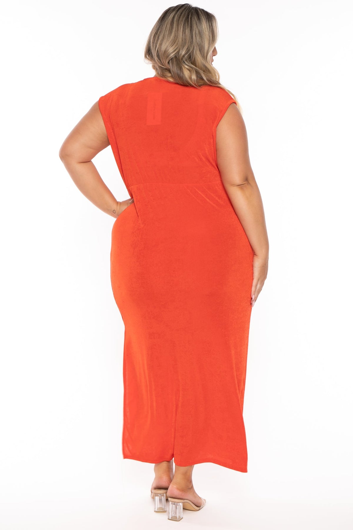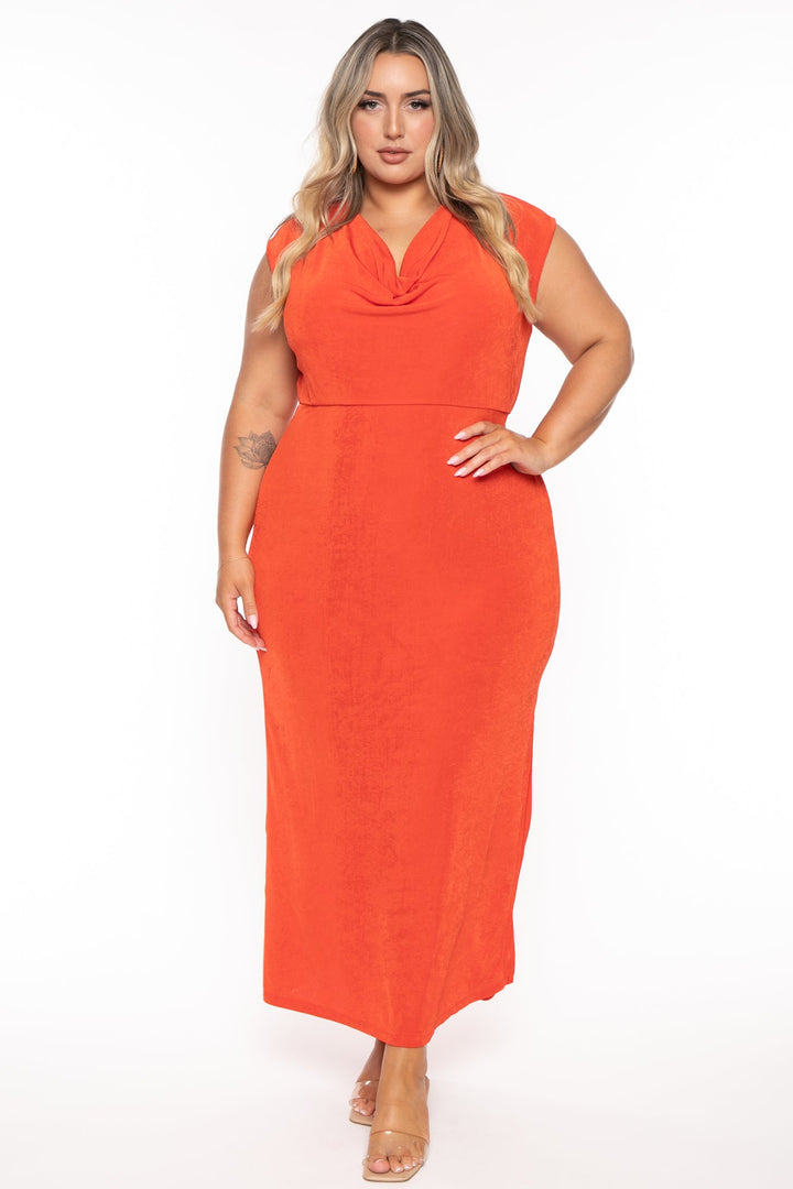 This Plus Size Maxi dress features a cowl neck, sleeveless cut, slit in a maxi silhouette