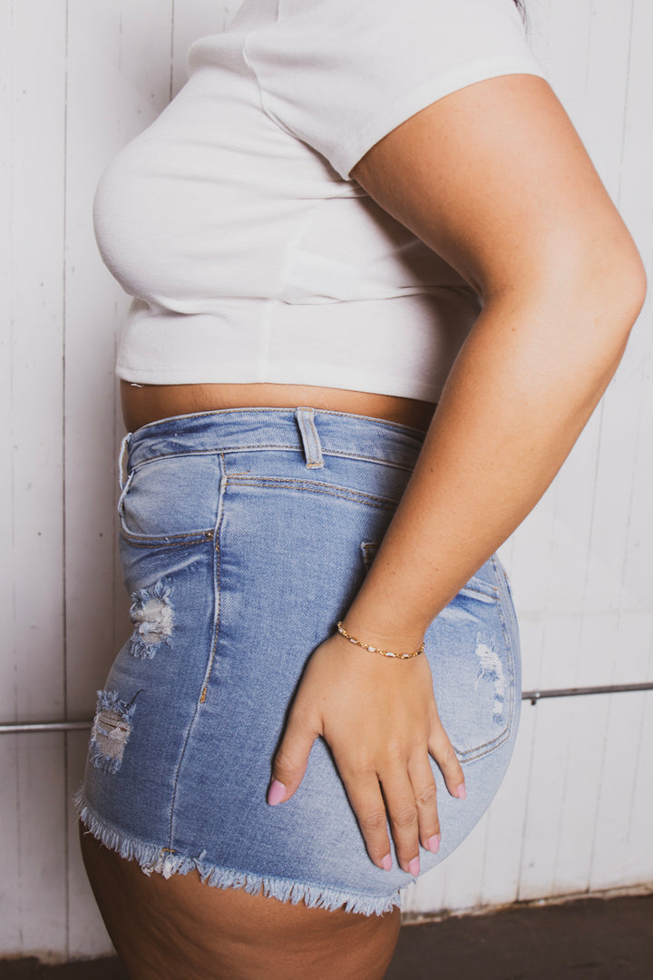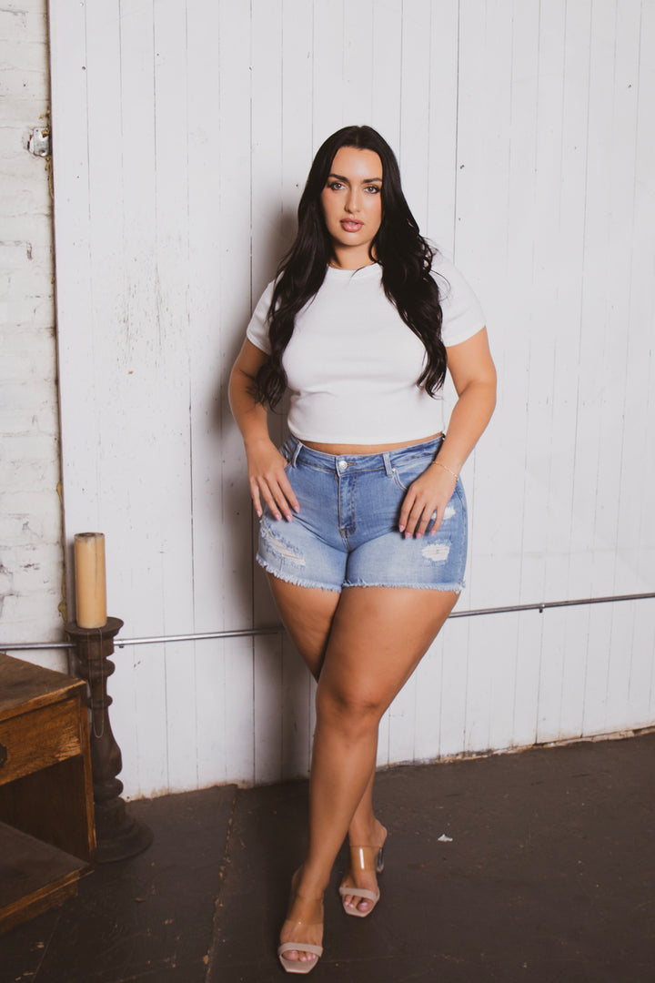 This plus size, stretch shorts features, zip up button closure, five pockets, destroyed thought out and fray hem